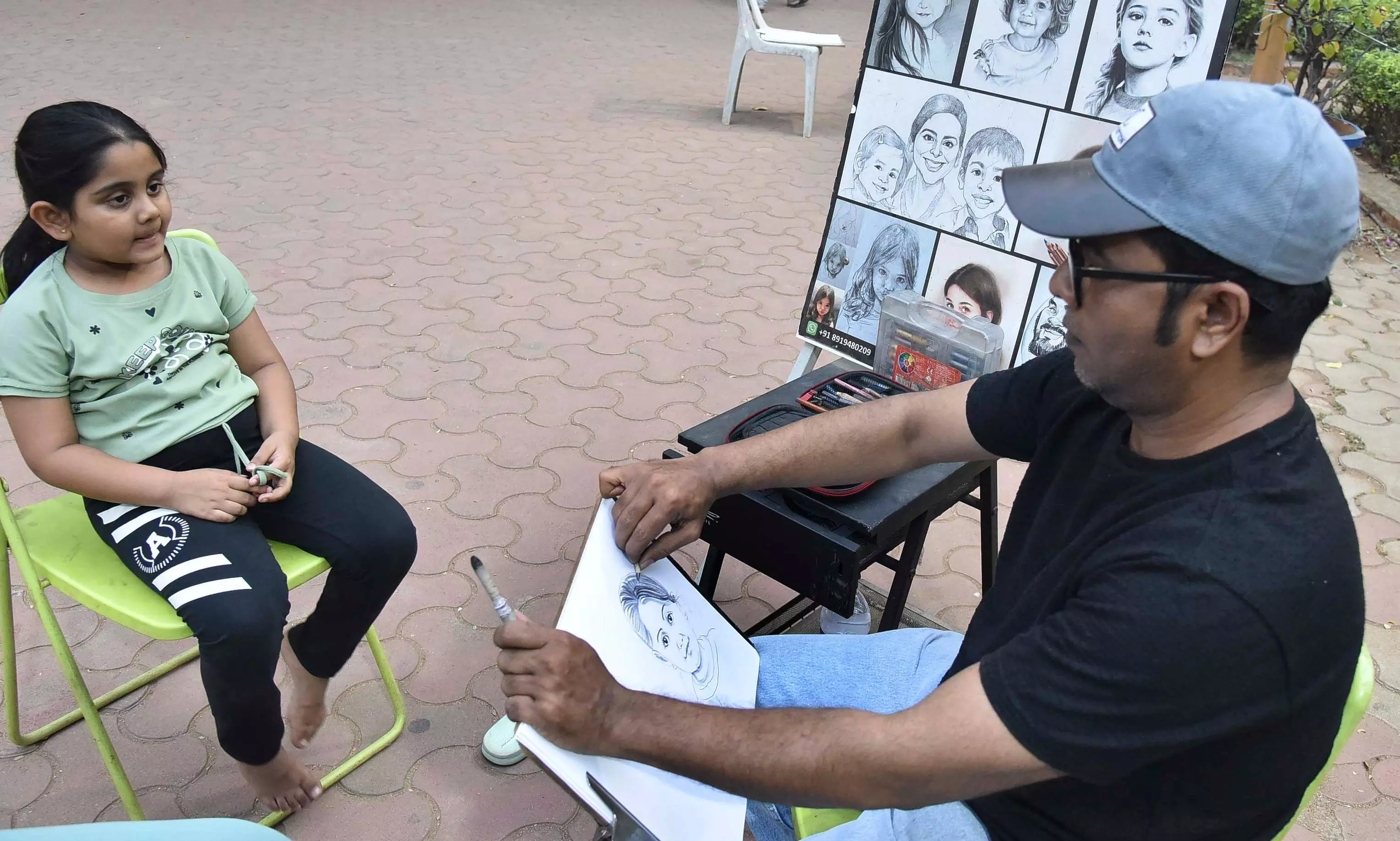 Artists at Shilparamam said interest in handmade portraits has dipped slightly as people turn to free, technology‑driven alternatives. Portrait artist Shaqueb explained the effort behind each work: a pencil sketch takes up to 30 minutes, watercolour portraits around two hours, acrylic paintings two days, and oil paintings more than five days to dry.