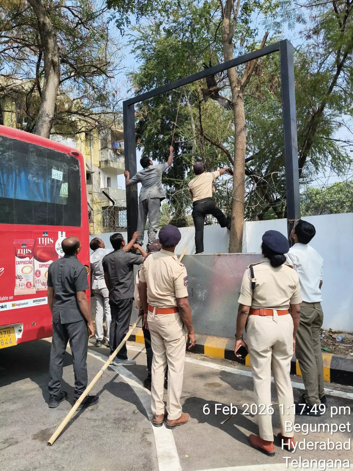 The struggling bird was noticed by A. Laxmi, additional DCP Malkajgiri, and G. Shankar Raju, ACP traffic, who were there on duty. Both officers stopped their vehicle and, with the assistance of traffic police staff, safely brought the kite down without the bird suffering further injury.