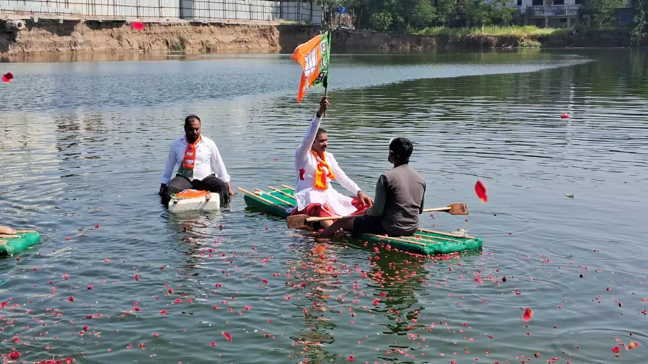 BJP workers wear masks of ruling party leaders and row boats across a flooded pit meant for a bus stand to highlight civic neglect.