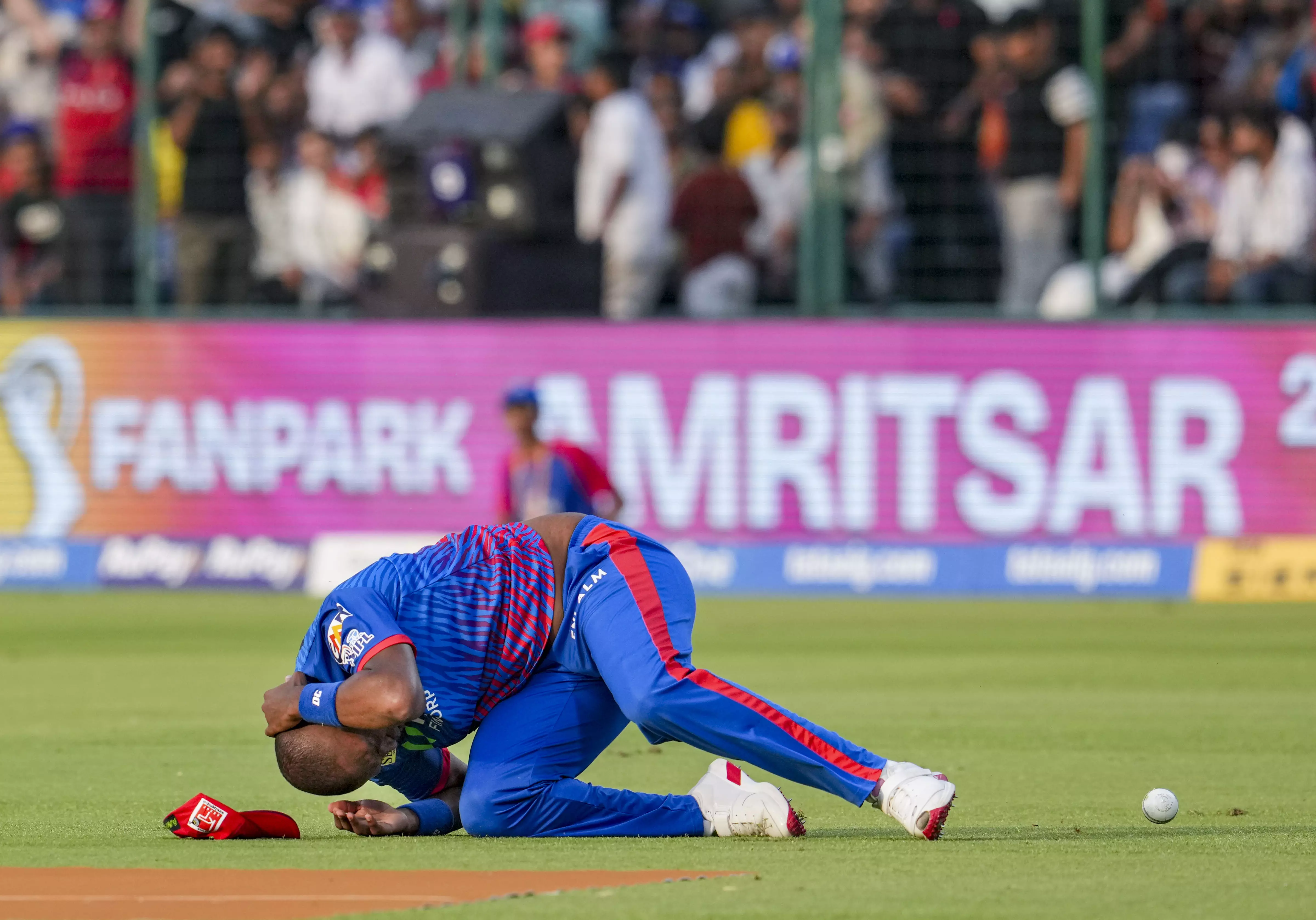 New Delhi: Delhi Capitals' Lungi Ngidi loses balance after an unsuccessful catch attempt during the Indian Premier League (IPL) 2026 T20 cricket match between Delhi Capitals and Punjab Kings, in New Delhi, Saturday, April 25, 2026. (PTI Photo/Karma Bhutia)