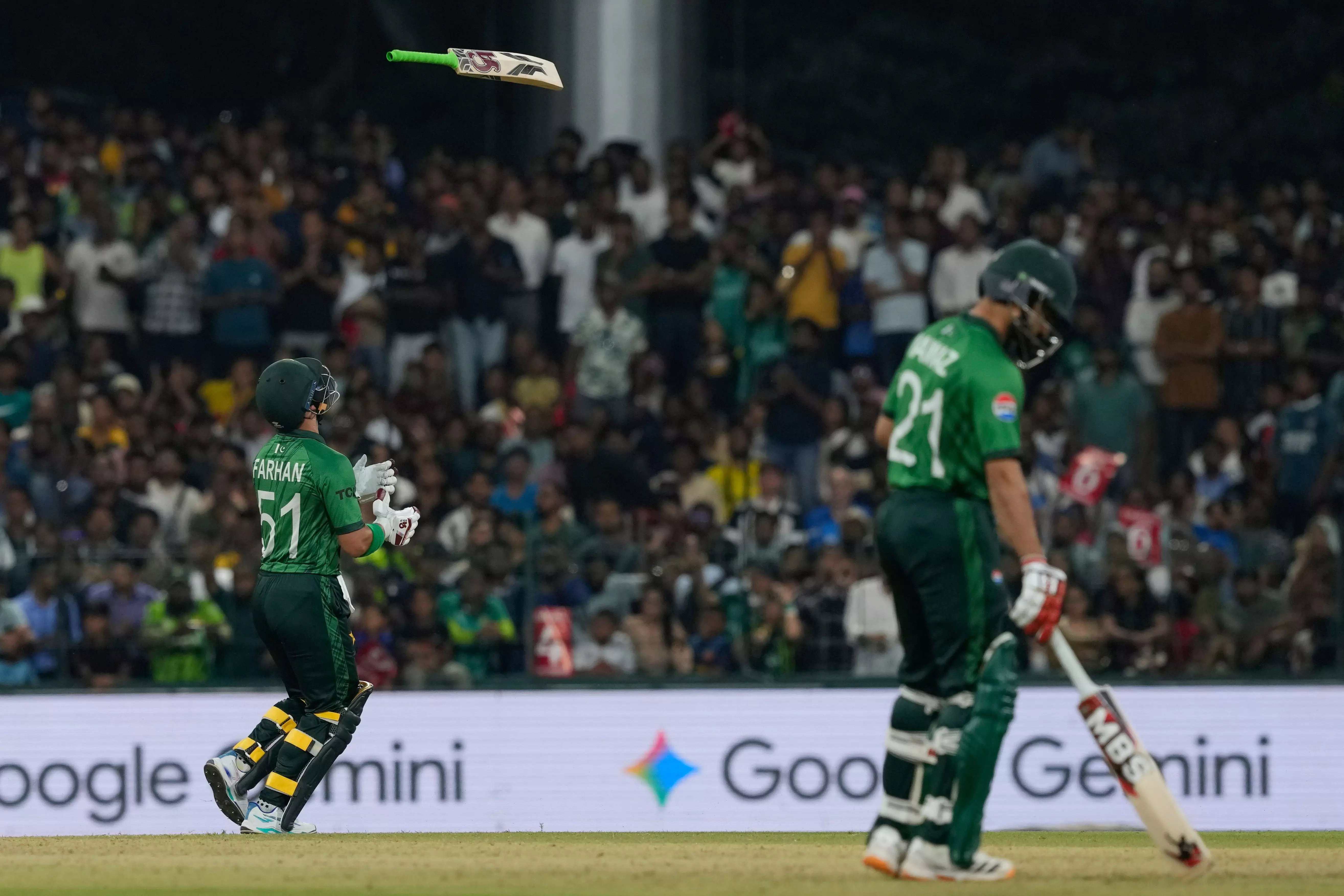Pakistan's Sahibzada Farhan tosses his bat in the air after losing his wicket during the T20 World Cup cricket match between Pakistan and the United States in Colombo, Sri Lanka, Tuesday, Feb. 10, 2026. - AP