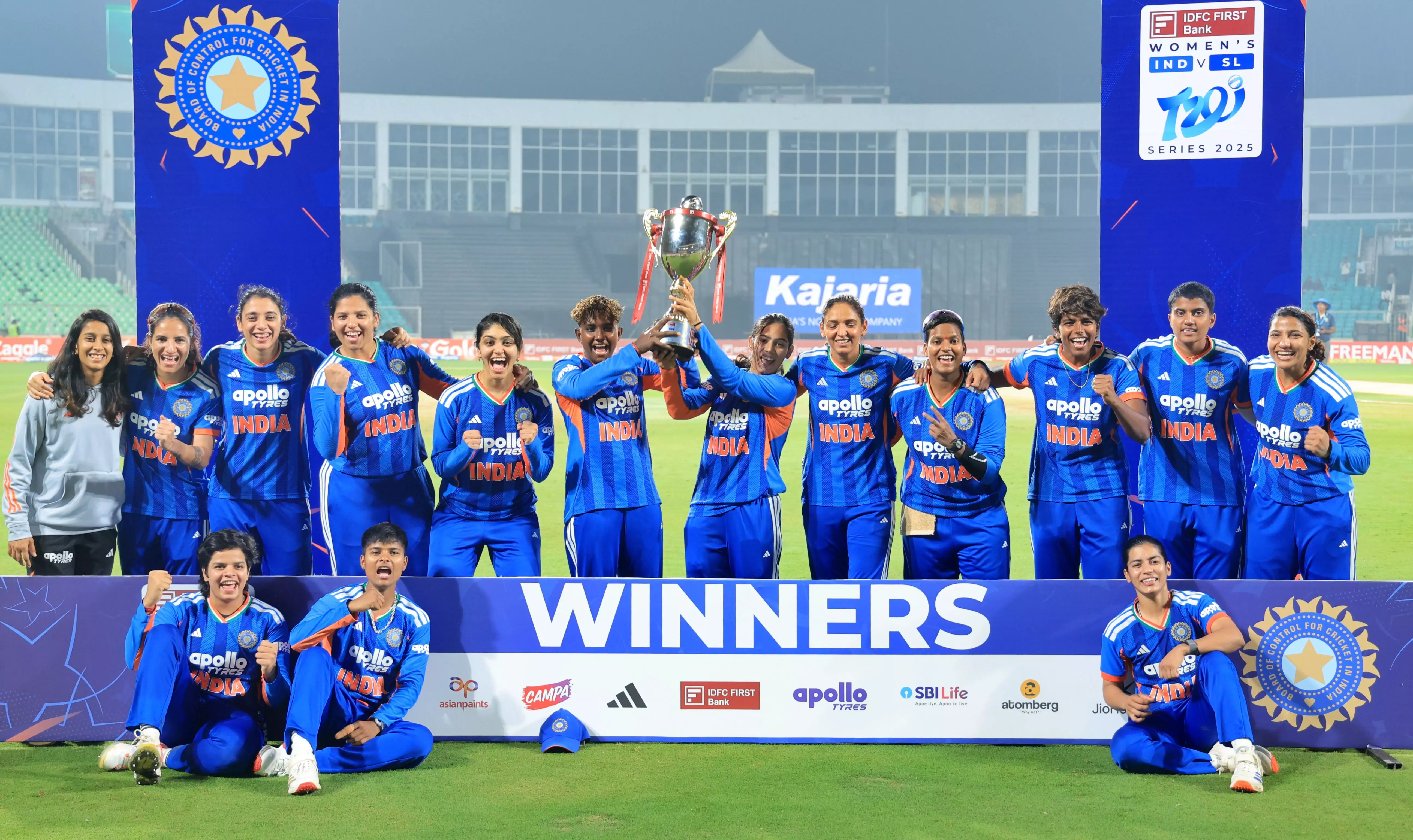 Thiruvananthapuram: India's players celebrate with the trophy after winning the T20 International cricket match series against Sri Lanka at the Greenfield International Stadium in Thiruvananthapuram, Kerala, Tuesday, Dec. 30, 2025. India Women won by 15 runs. - PTI