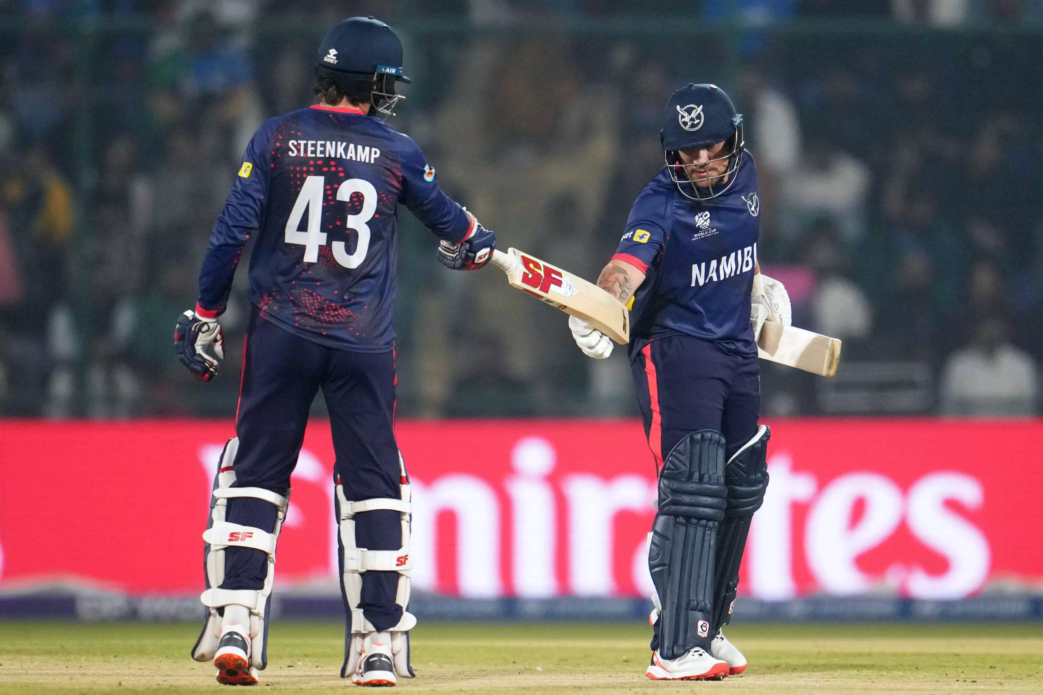 Jan Nicol Loftie-Eaton was unbeaten on 11 from 9 balls, while captain Gerhard Erasmus had just arrived at the crease on 3 from 3 deliveries as the pair looked to rebuild. Namibia scored 49 runs in the last five overs but also lost two wickets in that phase, denting their rhythm.
