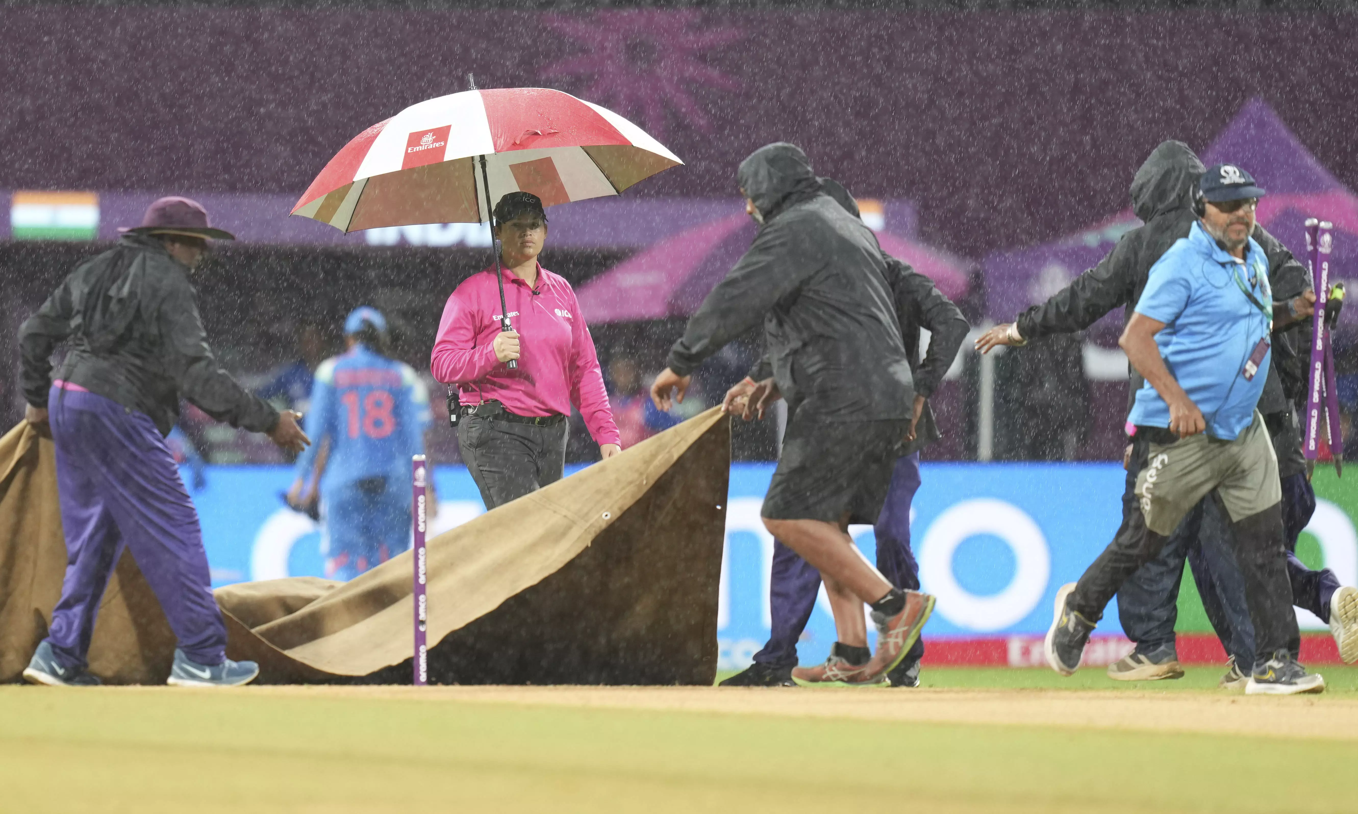 Navi Mumbai: Ground staff covers the pitch as rain stops play during an ICC Women's World Cup 2025 ODI cricket match between India Women and Bangladesh Women, at DY Patil Stadium, in Navi Mumbai, Sunday, Oct. 26, 2025. (PTI Photo/Shashank Parade)