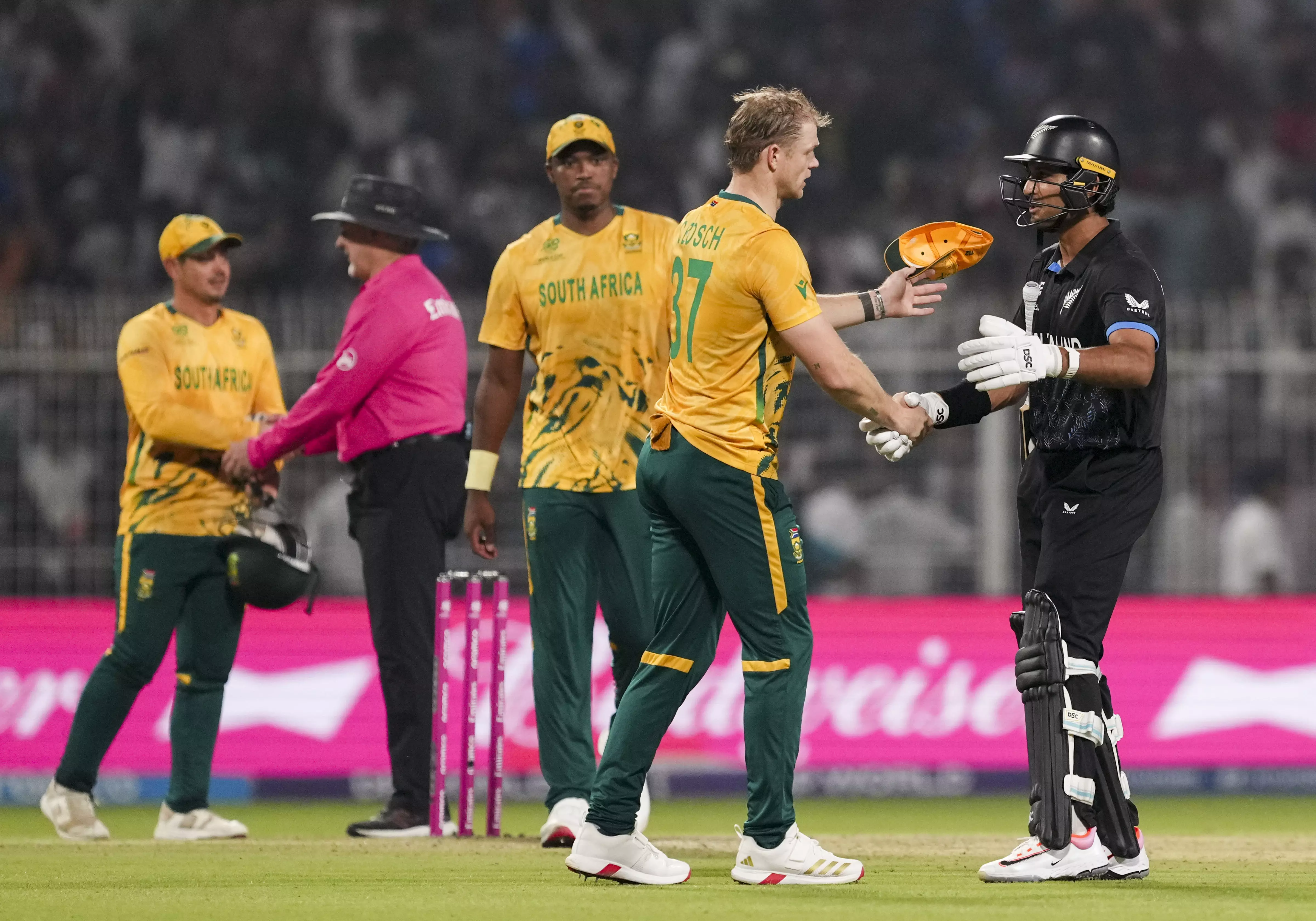 New Zealand's Rachin Ravindra being greeted by South Africa's Corbin Bosch after the former's team won the ICC Men's T20 World Cup 2026 first semifinal cricket match against South Africa, at Eden Gardens, in Kolkata, Wednesday, March 4, 2026. (PTI Photo)