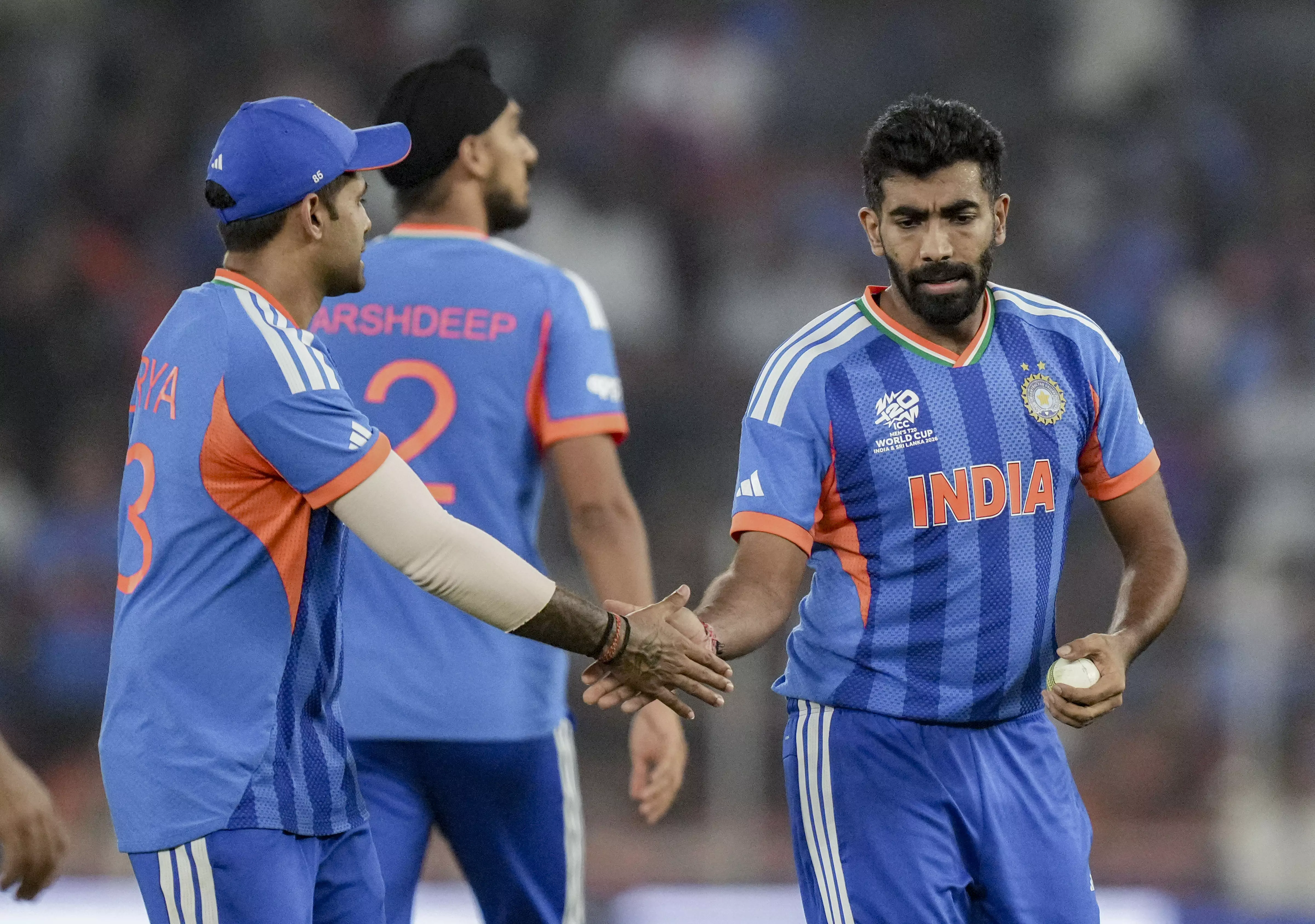 India's Jasprit Bumrah celebrates with teammates after taking the wicket of Netherlands' captain Scott Edwards during an ICC Men's T20 World Cup 2026 cricket match between India and Netherlands, at the Narendra Modi Stadium, in Ahmedabad. (PTI Photo/Kamal Kishore)