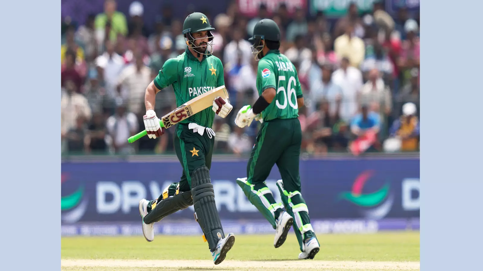 Pakistan's Sahibzada Farhan, left, and batting partner Babar Azam run between the wickets during the T20 World Cup cricket match between Netherlands and Pakistan in Colombo, Sri Lanka, Feb. 7, 2026. (AP Photo/Eranga Jayawardena)