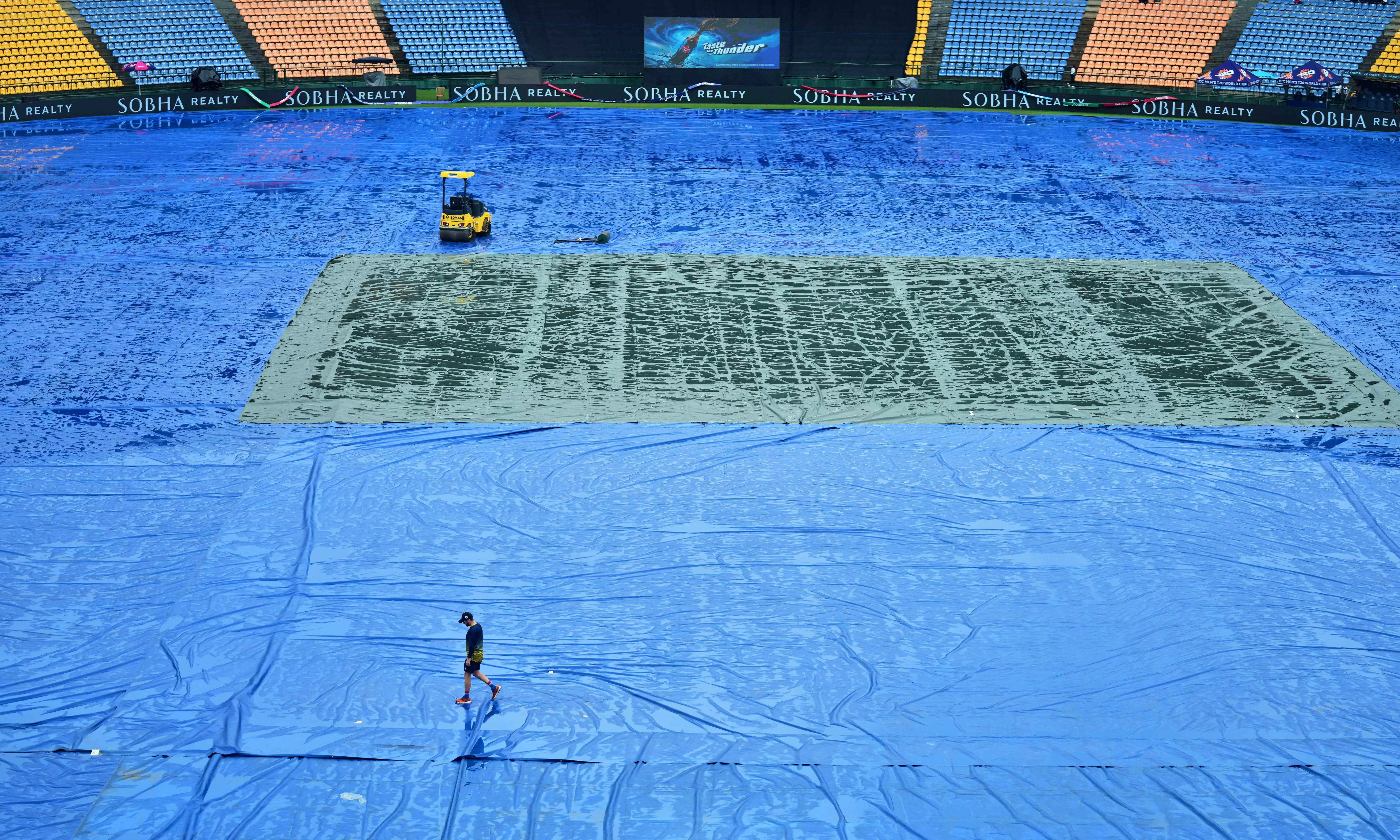 A support staff member of Ireland team walks on the covered ground as rain delayed the start of play during the T20 World Cup cricket match between Ireland and Zimbabwe in Pallekele, Sri Lanka. AP/PTI