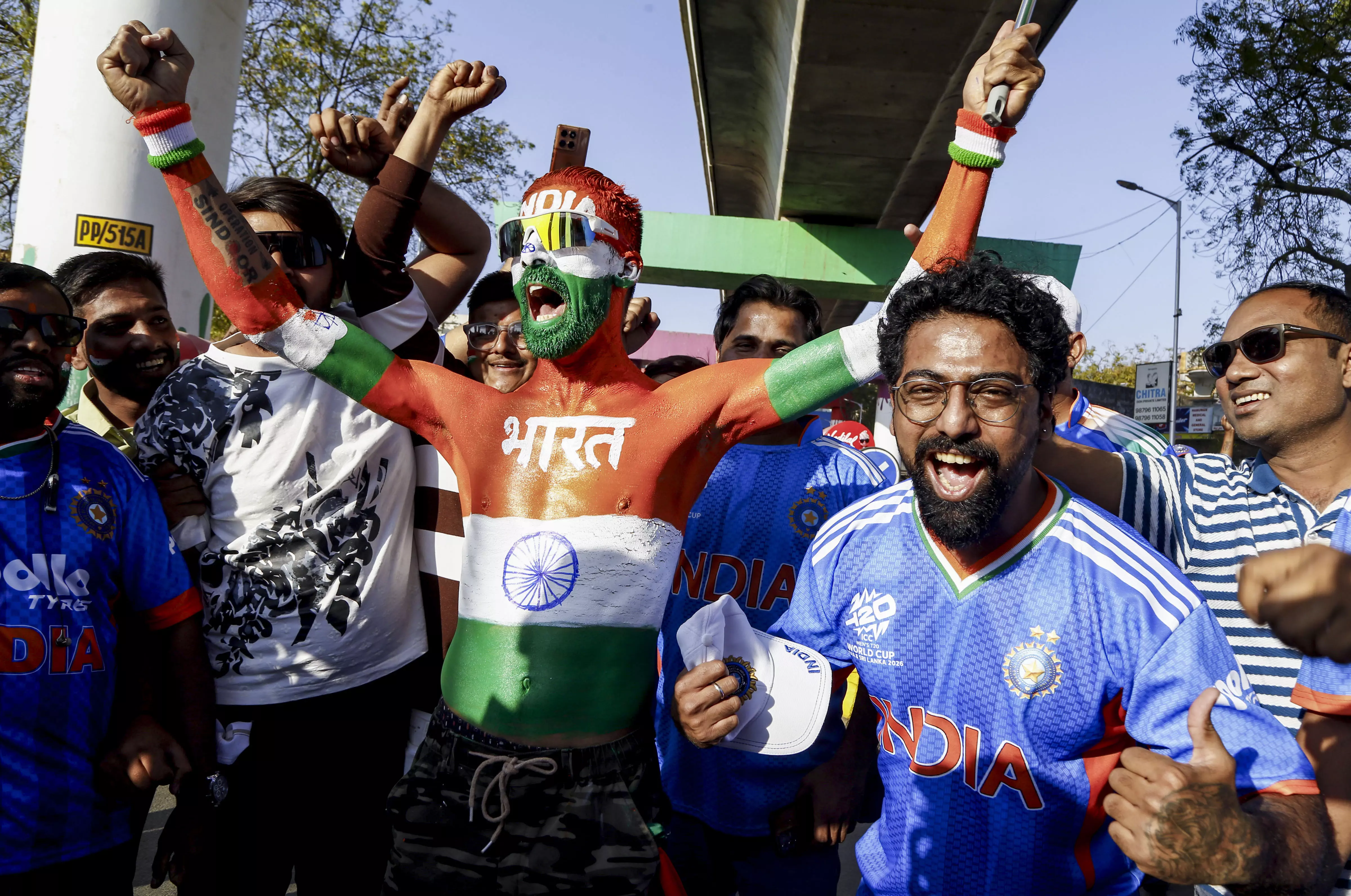 Ahmedabad: Cricket fans cheer outside the Narendra Modi stadium ahead of an ICC Men's T20 World Cup 2026 cricket match between India and South Africa, in Ahmedabad, Sunday, Feb. 22, 2026. - PTI