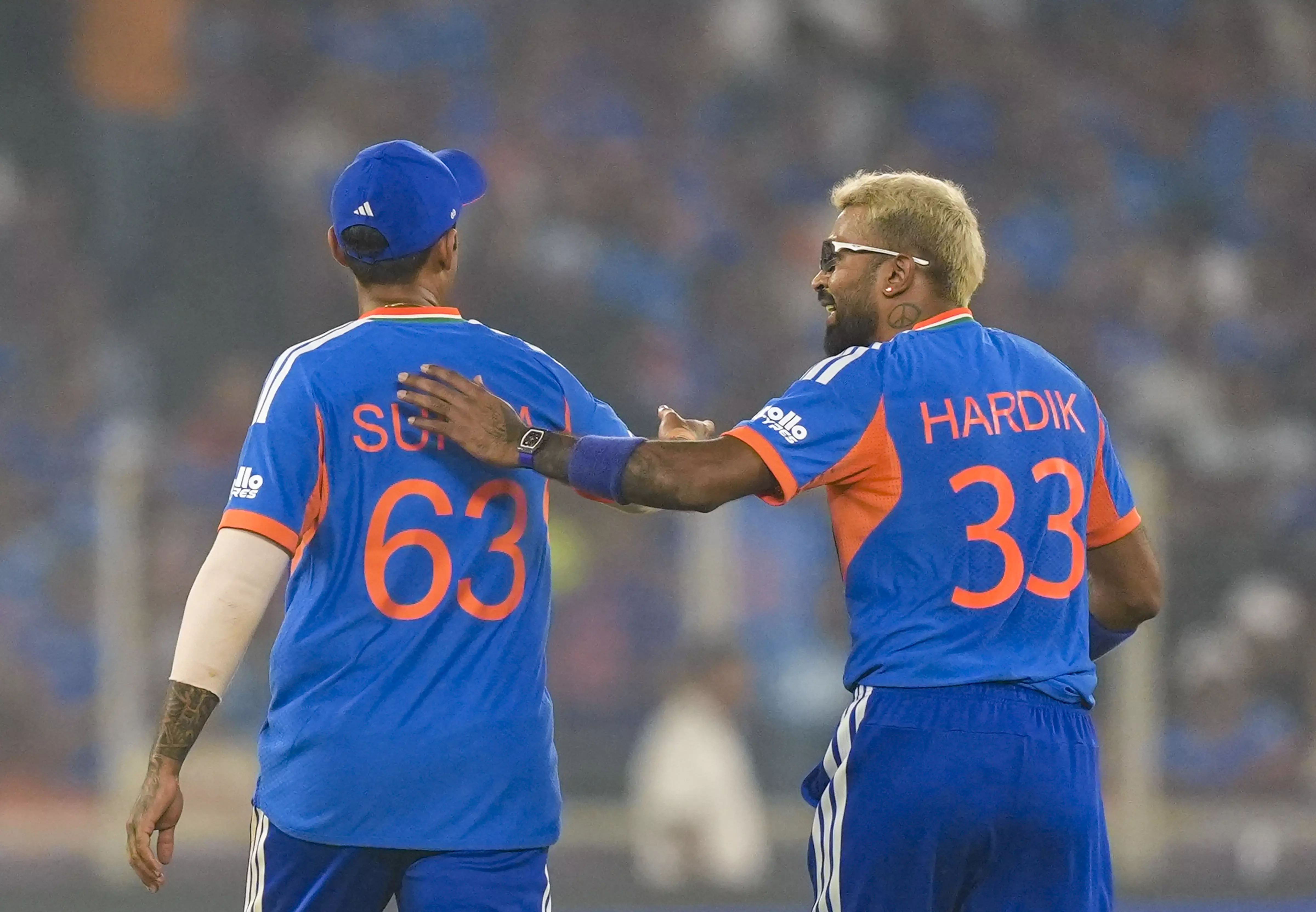 Ahmedabad: India's captain Suryakumar Yadav, left, and Hardik Pandya during an ICC Men's T20 World Cup 2026 cricket match between India and South Africa, at the Narendra Modi Stadium, in Ahmedabad, Sunday, Feb. 22, 2026. - PTI - 22 Feb 2026 8:35 PM IST