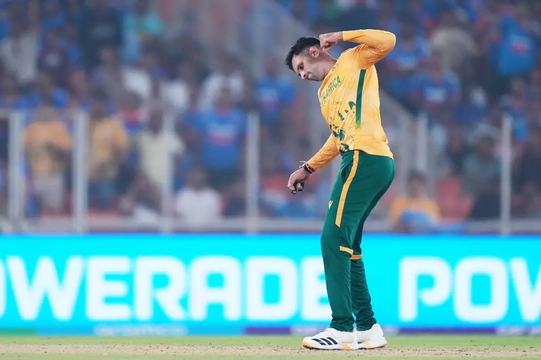 South Africa's Keshav Maharaj celebrates the wicket of India's Arshdeep Singh during the T20 World Cup cricket match between India and South Africa in Ahmedabad, India, Sunday, Feb. 22, 2026. - AP