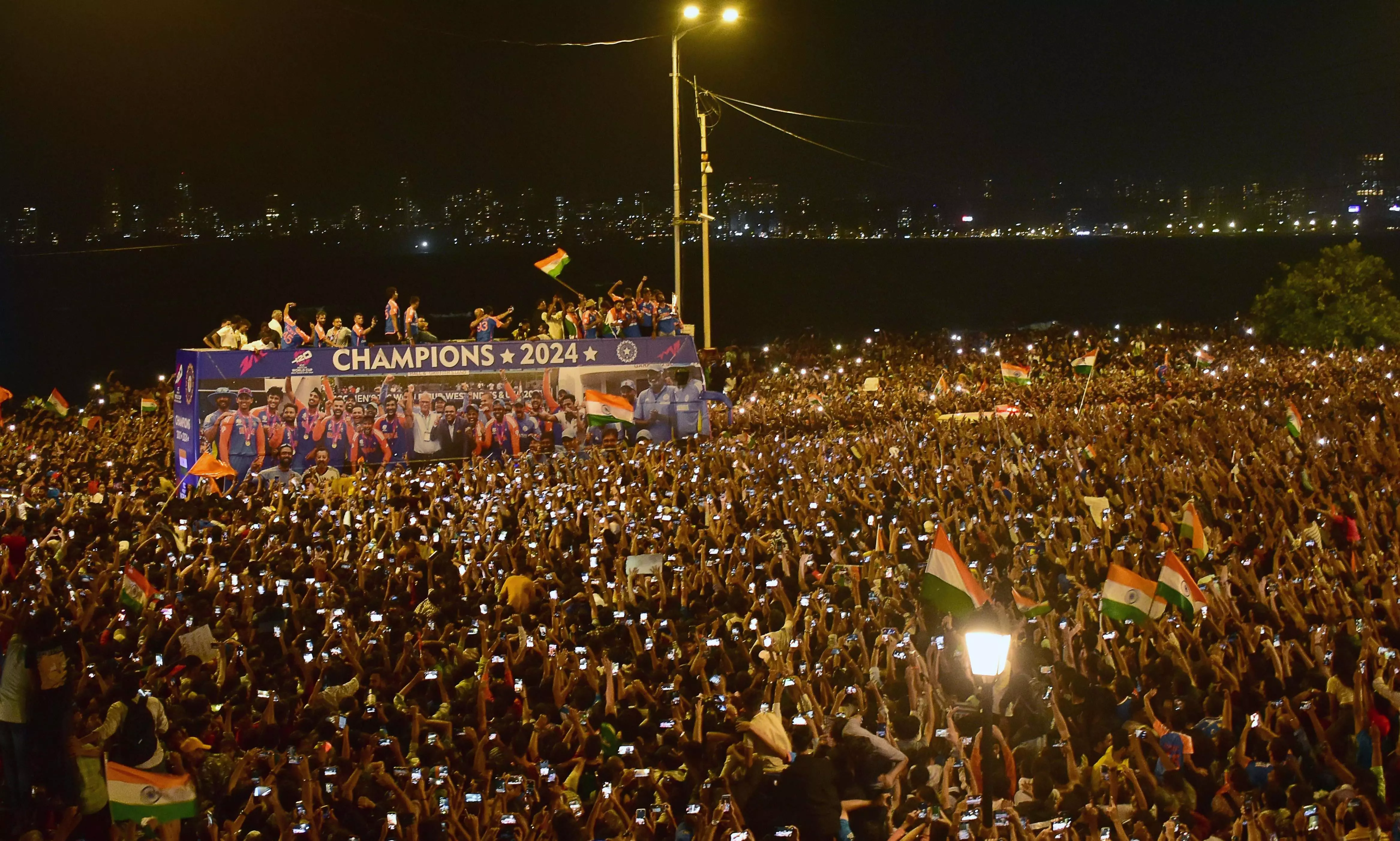 Mumbai: An ocean of humanity greeted the victory parade of the T20 World Cup winning Indian team in South Mumbai's Marine Drive as thousands of passionate fans gathered to catch a glimpse of their favourite stars, bringing the traffic to a complete standstill.