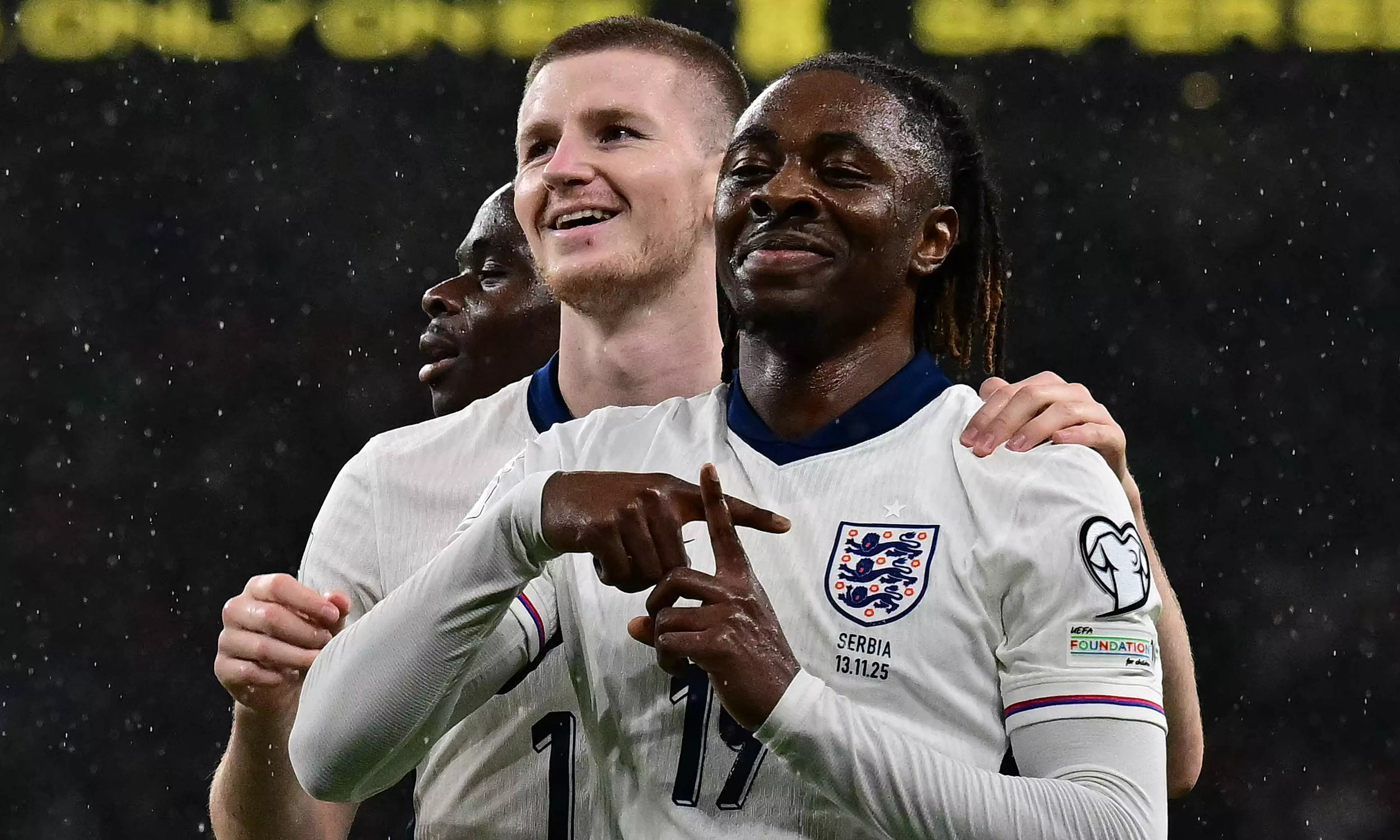 England's midfielder Eberechi Eze (R) celebrates scoring his team's second goal during the men's football World Cup 2026 Group K qualifier between England and Serbia at Wembley Stadium in London on November 13, 2025. (Photo by AFP)