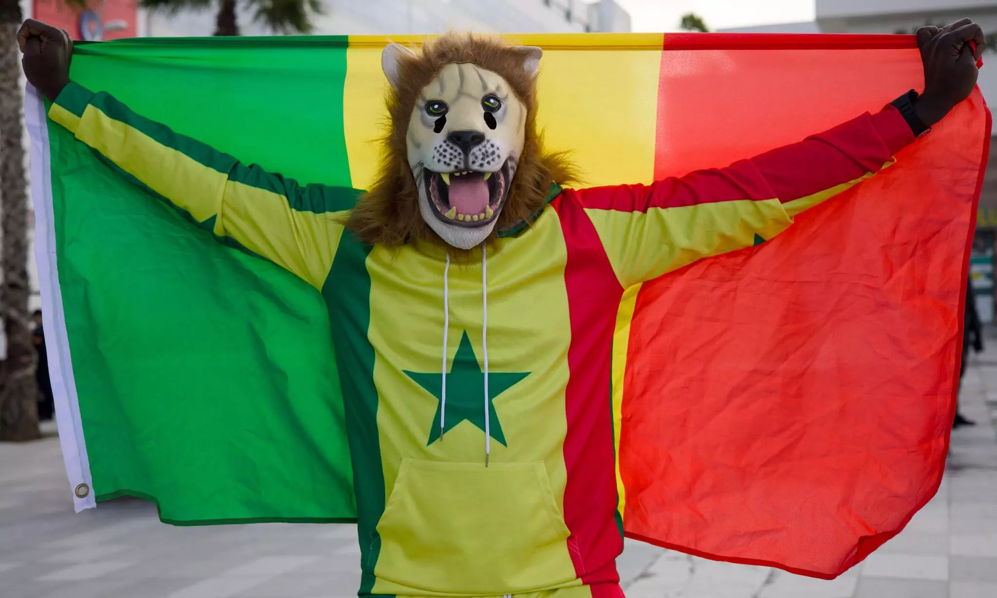 Senegal fan Pape, dressed as a lion, holds the Senegal flag at the Africa Cup of Nations in Tangier, Morocco, Dec. 23, 2025. (AP Photo)