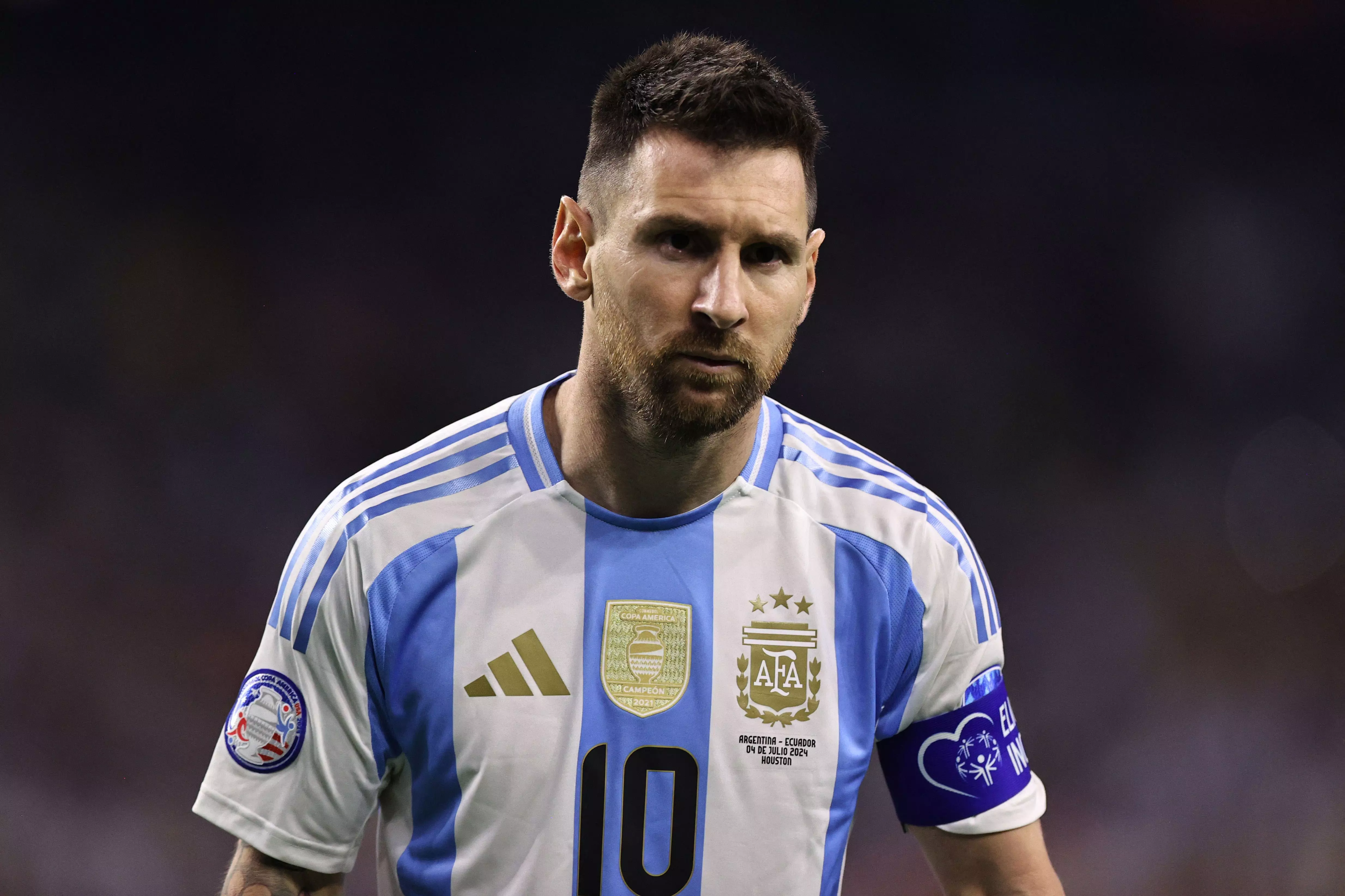 Lionel Messi of Argentina looks on during the CONMEBOL Copa America 2024 quarter-final match between Argentina and Ecuador at NRG Stadium on July 04, 2024 in Houston, Texas. Omar Vega/Getty Images/AFP