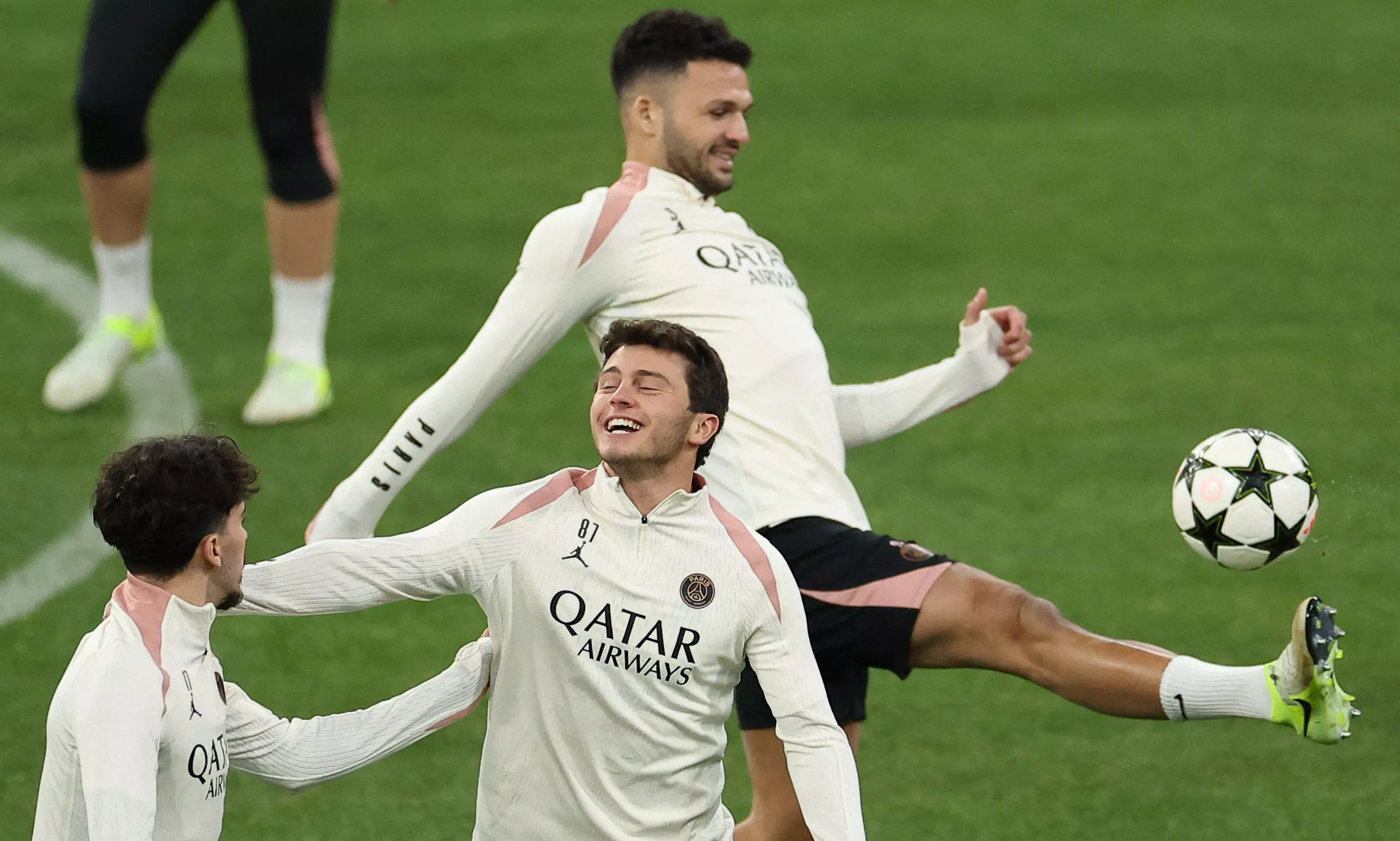 Paris Saint-Germain's Portuguese midfielder #17 Vitinha, Paris Saint-Germain's Portuguese midfielder #87 Joao Pedro Goncalves Neves and Paris Saint-Germain's Portuguese forward #09 Goncalo Ramos take part in a training session on the eve of the UEFA Champions League football match against FC Bayern Munich at the Allianz Arena in Munich, Germany (FRANCK FIFE / AFP)