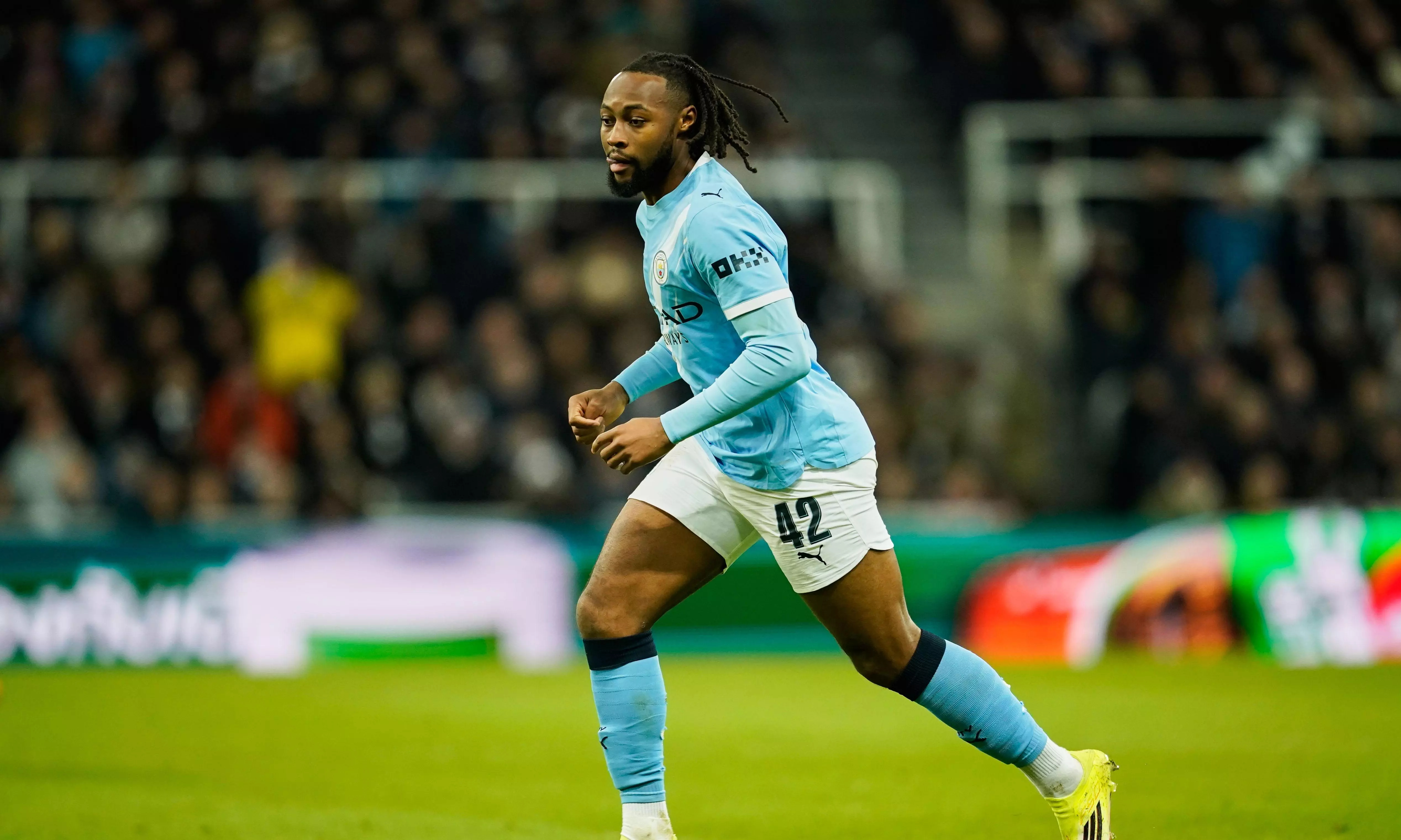 Manchester City's Antoine Semenyo runs during the English League Cup semifinal first leg soccer match between Newcastle and Manchester City in Newcastle, England (AP Photo/Dave Thompson)