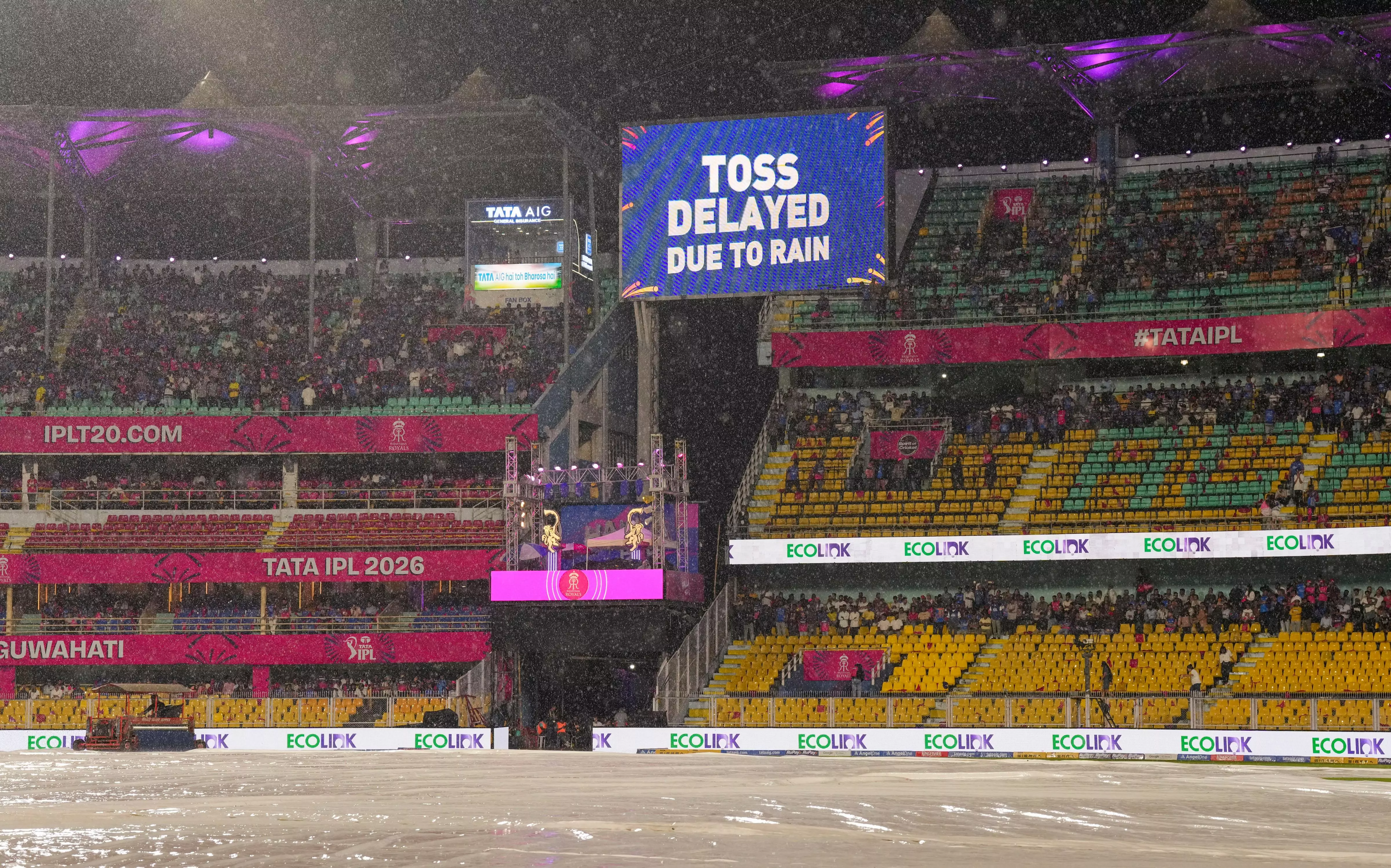 View of the ground covered due to rain as a screen displays 'Toss delayed due to rain' during an Indian Premier League (IPL) 2026 T20 cricket match between Rajasthan Royals and Mumbai Indians, in Guwahati, Tuesday, April 7, 2026. (PTI Photo)