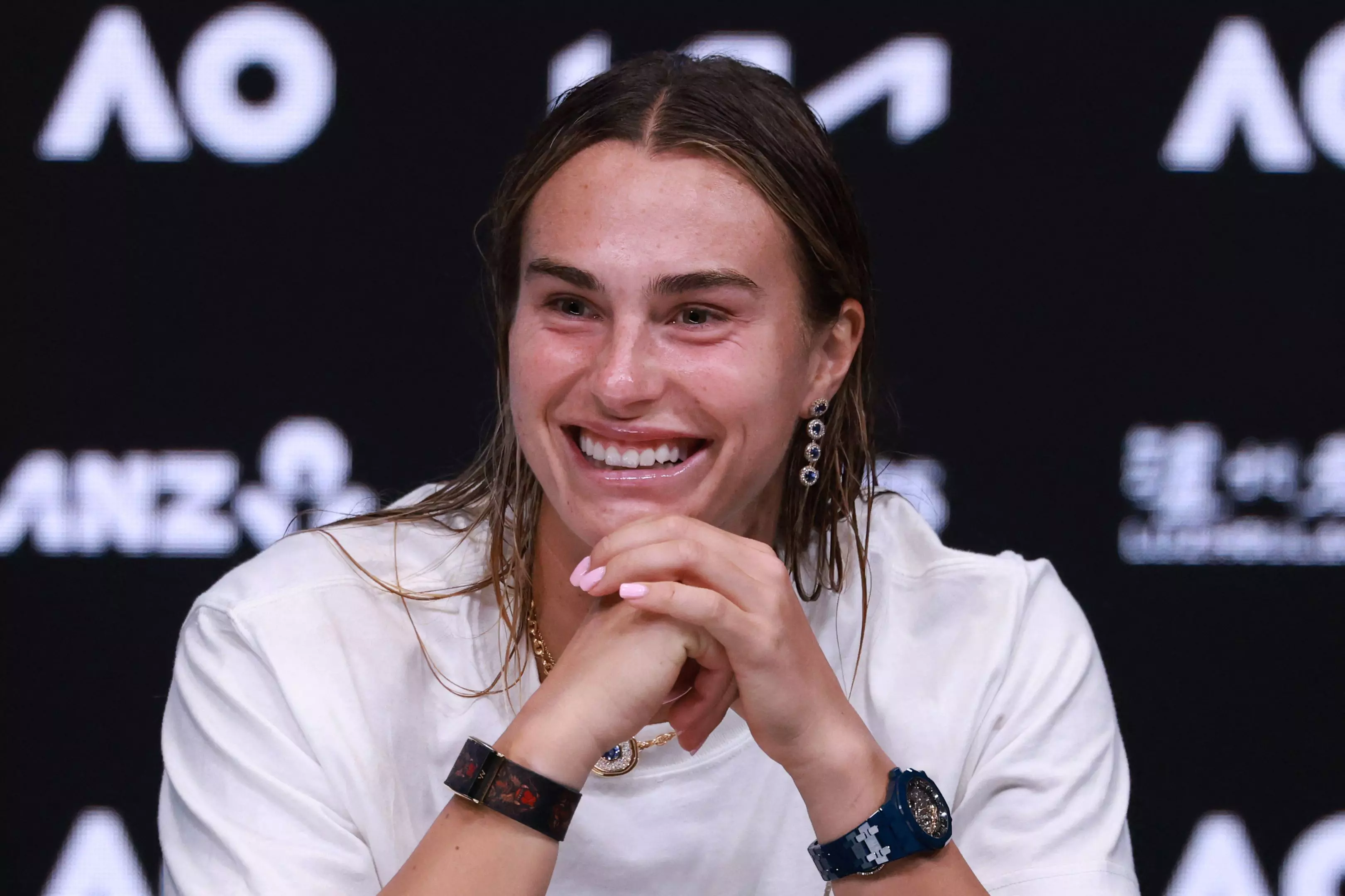 Belarus' Aryna Sabalenka speaks during a press conference after her defeat against Kazakhstan's Elena Rybakina during their women's singles final match on day fourteen of the Australian Open tennis tournament in Melbourne on January 31, 2026.