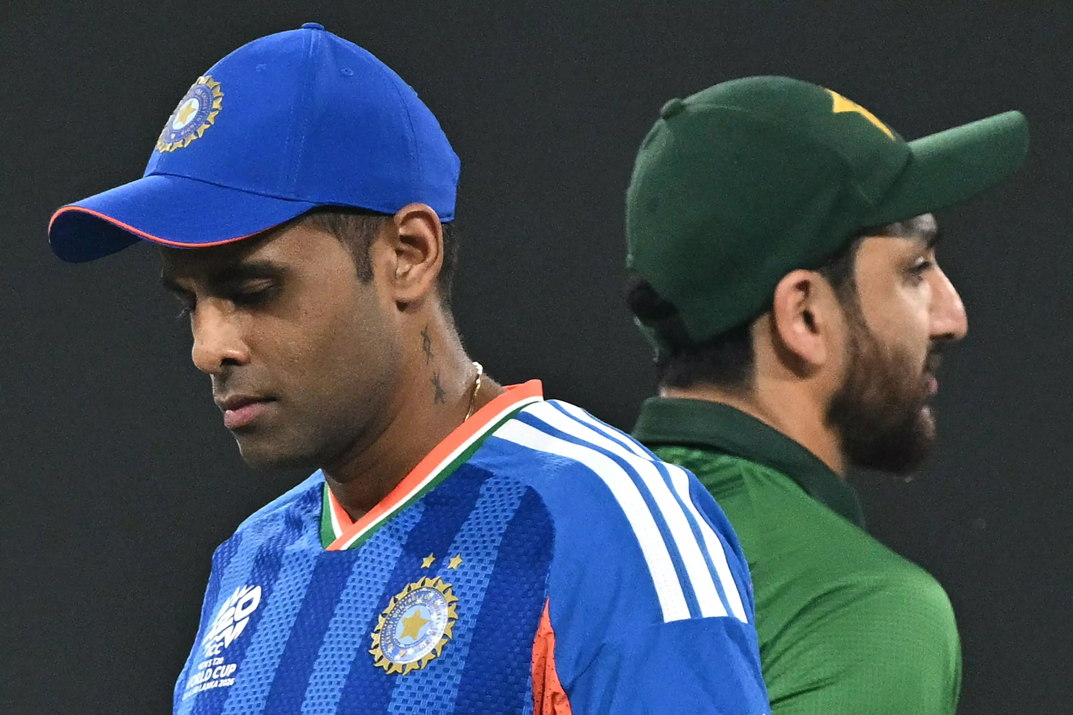 India's captain Suryakumar Yadav (L) walks past his Pakistan counterpart Salman Agha after the toss before the start of the 2026 ICC Men's T20 Cricket World Cup group stage match between India and Pakistan at the R Premadasa Stadium in Colombo on February 15, 2026. (Photo by AFP)