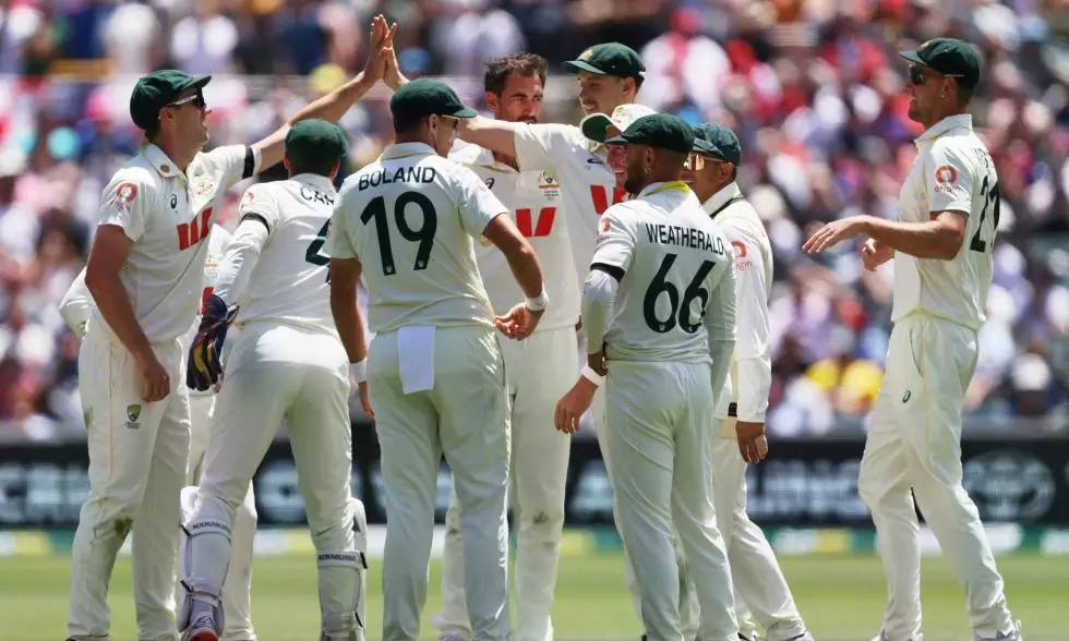 Australian players celebrate the dismissal of England’s Jamie Smith during play on the final day of the third Ashes cricket test between England and Australia in Adelaide, Australia, Sunday, Dec. 21, 2025. (AP Photo)