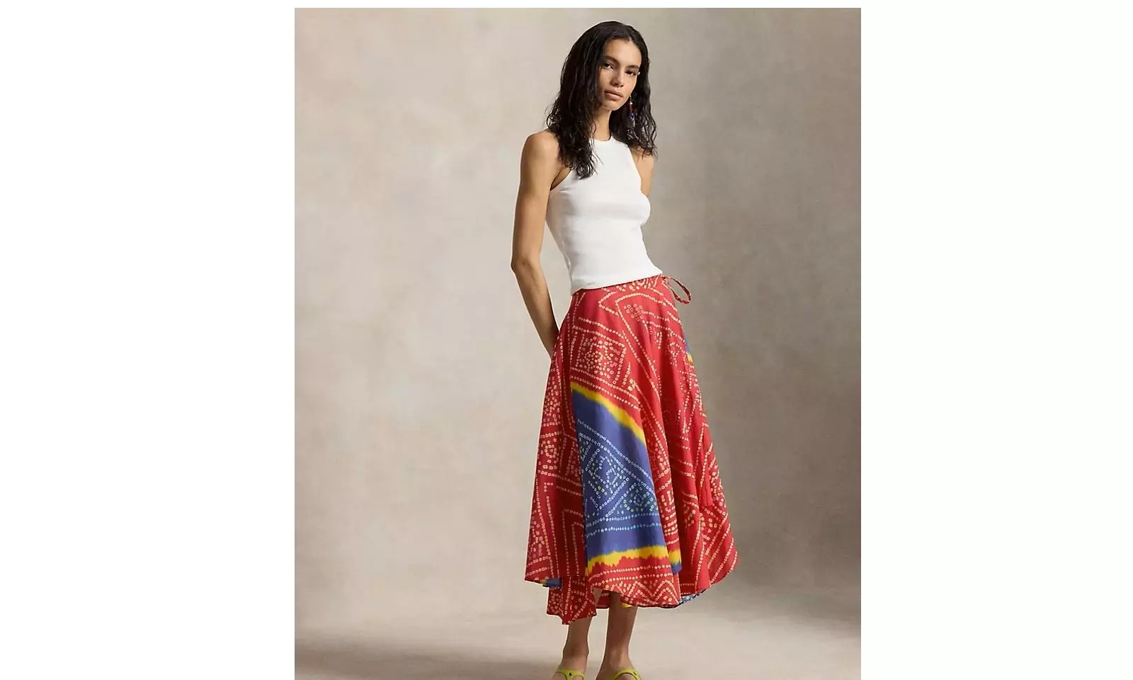 Just weeks after Ralph Lauren had its models flaunting Indian jhumkas at Paris Fashion Week, the brand has done it again. Its Summer 2026 collection features a printed wraparound tie-dye skirt—a blue, yellow, and red ankle-length piece reminiscent of bandhani skirts long worn by women across India.