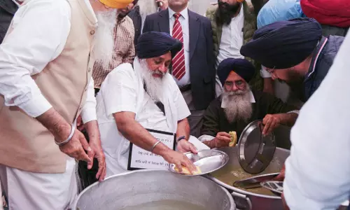 Sukhbir Badal performs sewadar duty at Takht Kesgarh Sahib