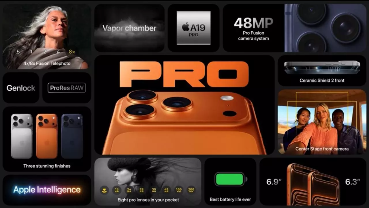 Powering it is the A19 Pro chip with a custom vapor chamber welded into the chassis for cooling, which Apple says delivers 40% better performance than the iPhone 16 Pro. The device also packs the largest battery ever in an iPhone, giving it the best battery life across the lineup.