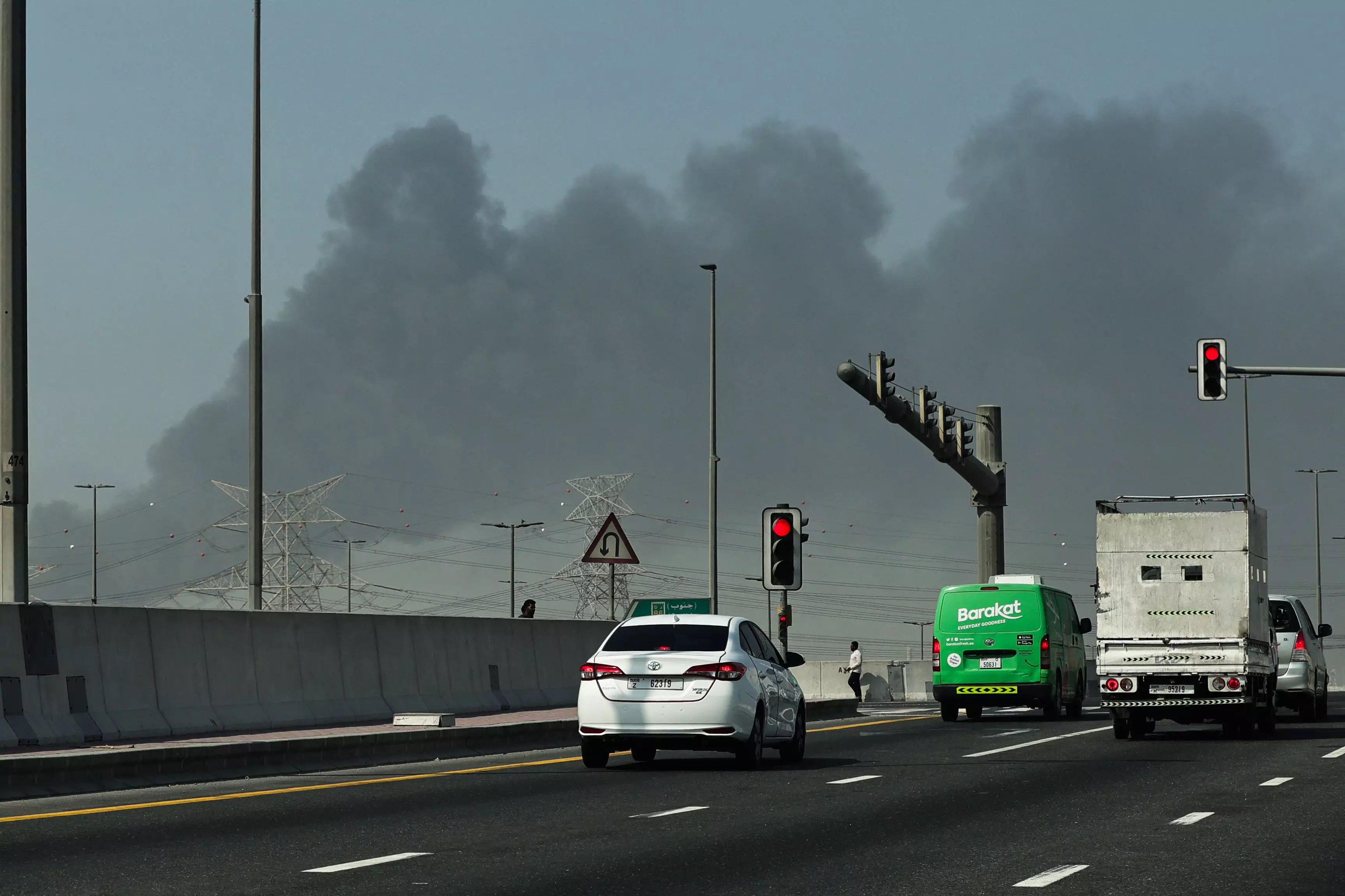Motorists drive along a street as smoke rises from the site of a reported Iranian strike in Dubai - AFP Photos