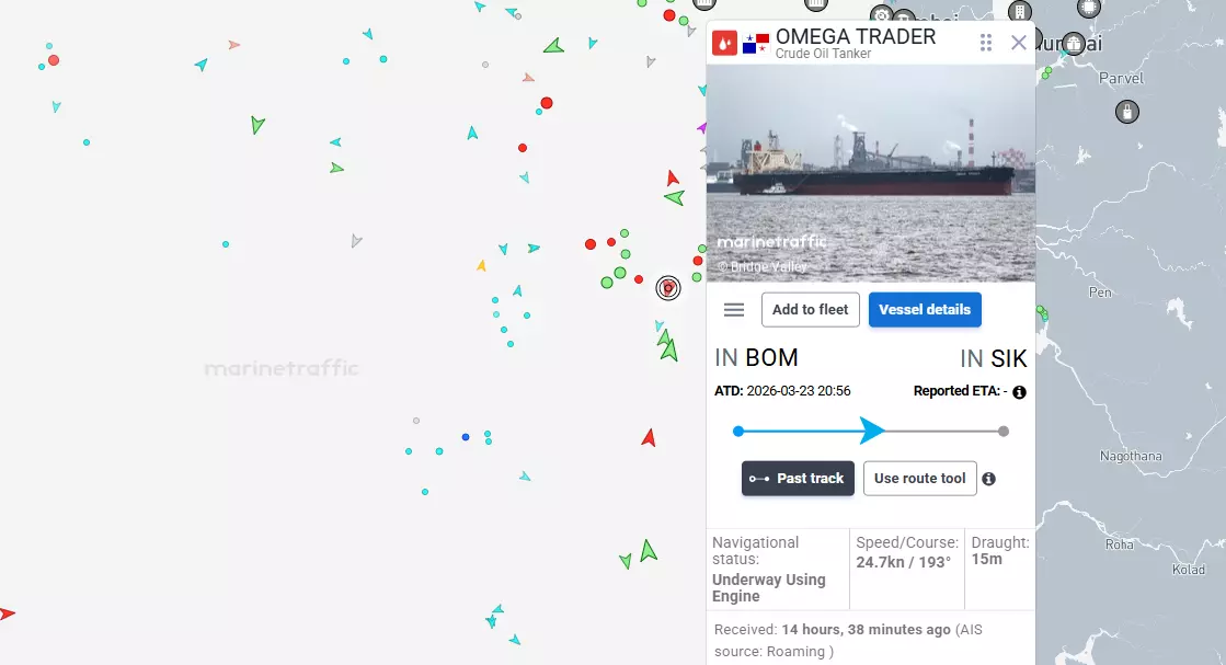 Its current status as tracked by Marine Tracking shows that the vessel, with a PANAMA flag, has departed from the Mumbai port, and is in transit to Sikka port in Gujarat.