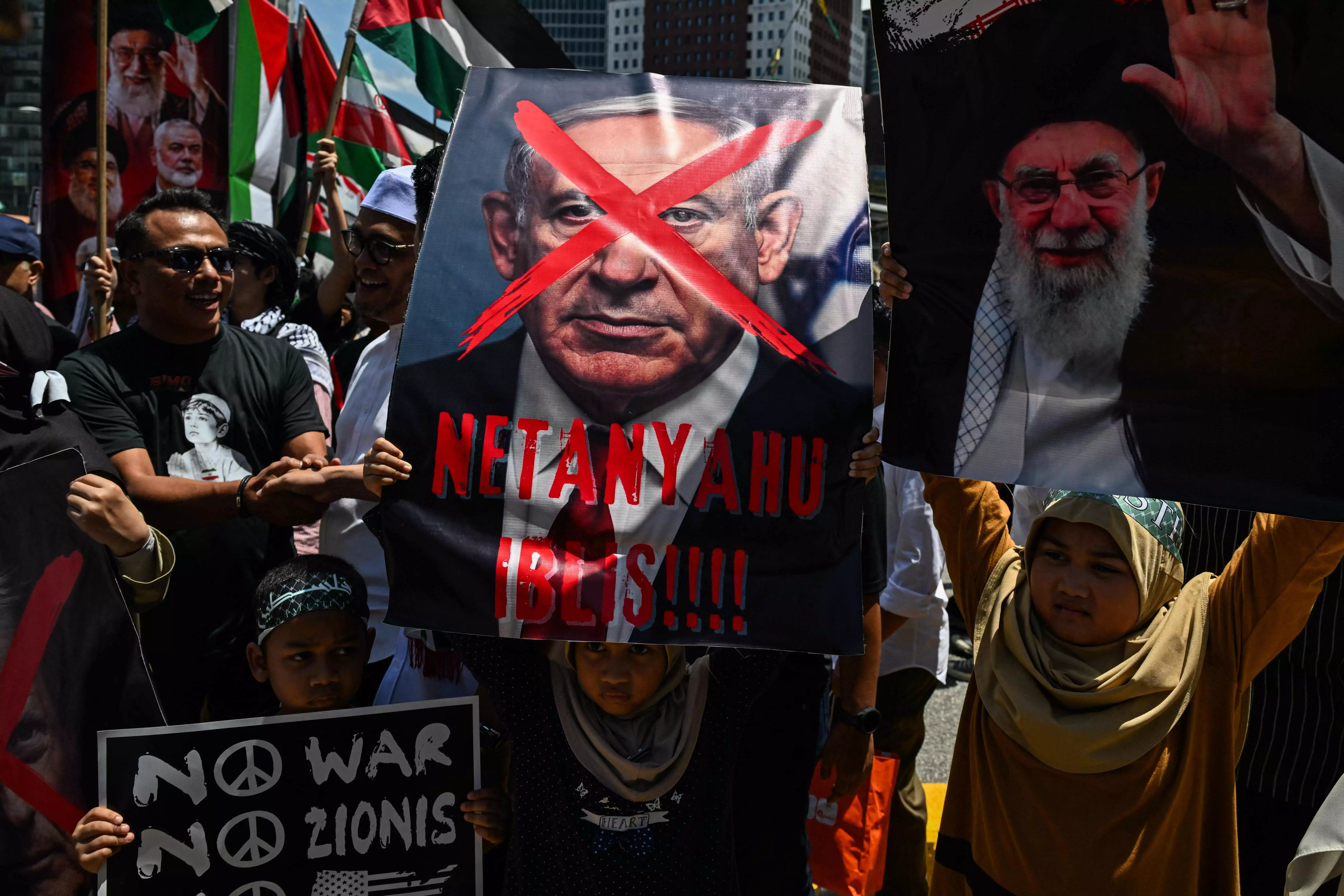 Children hold placards showing Israel's Prime Minister Benjamin Netanyahu and Iran's slain supreme leader Ayatollah Ali Khameneduring a demonstration to mark al-Quds (Jerusalem) Day, after Friday prayers in Kuala Lumpur (Mohd Rasfan / AFP)