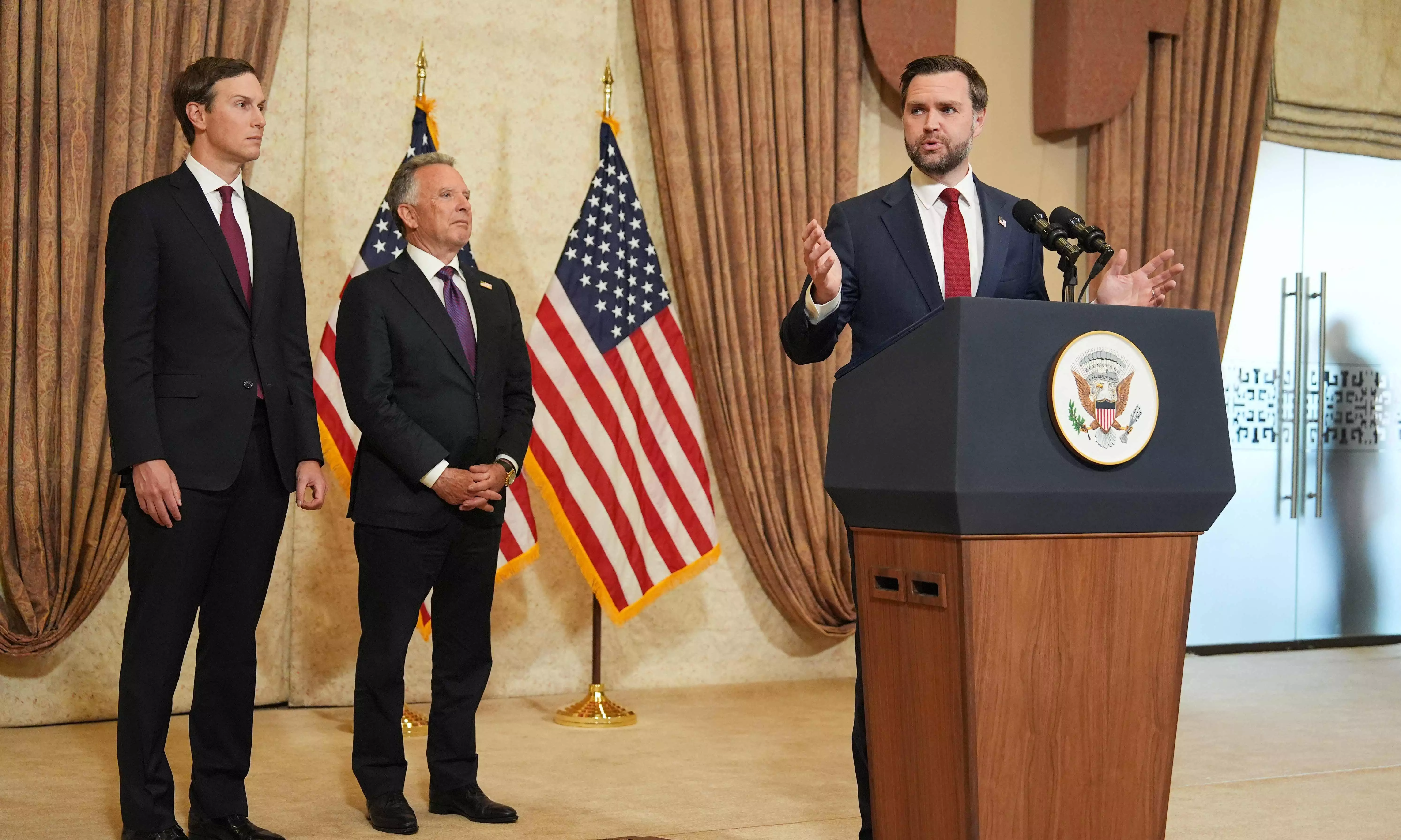US Vice President JD Vance (R) speaks during a news conference after meeting with representatives from Pakistan and Iran, as US President Donald Trump's son-in-law Jared Kushner (L) and US Special Envoy to the Middle East Steve Witkoff (C) watch, in Islamabad (Jacquelyn MARTIN / POOL / AFP file)
