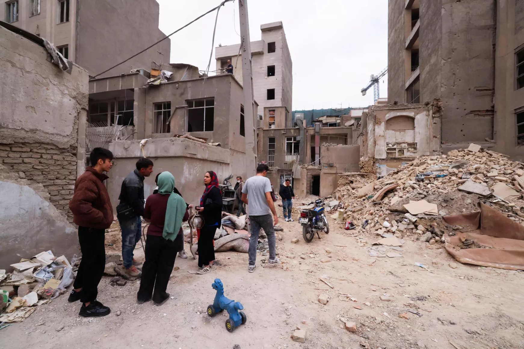 Iranians gather in front of destroyed buildings following a military strike on the Iranian capital Tehran (AFP)
