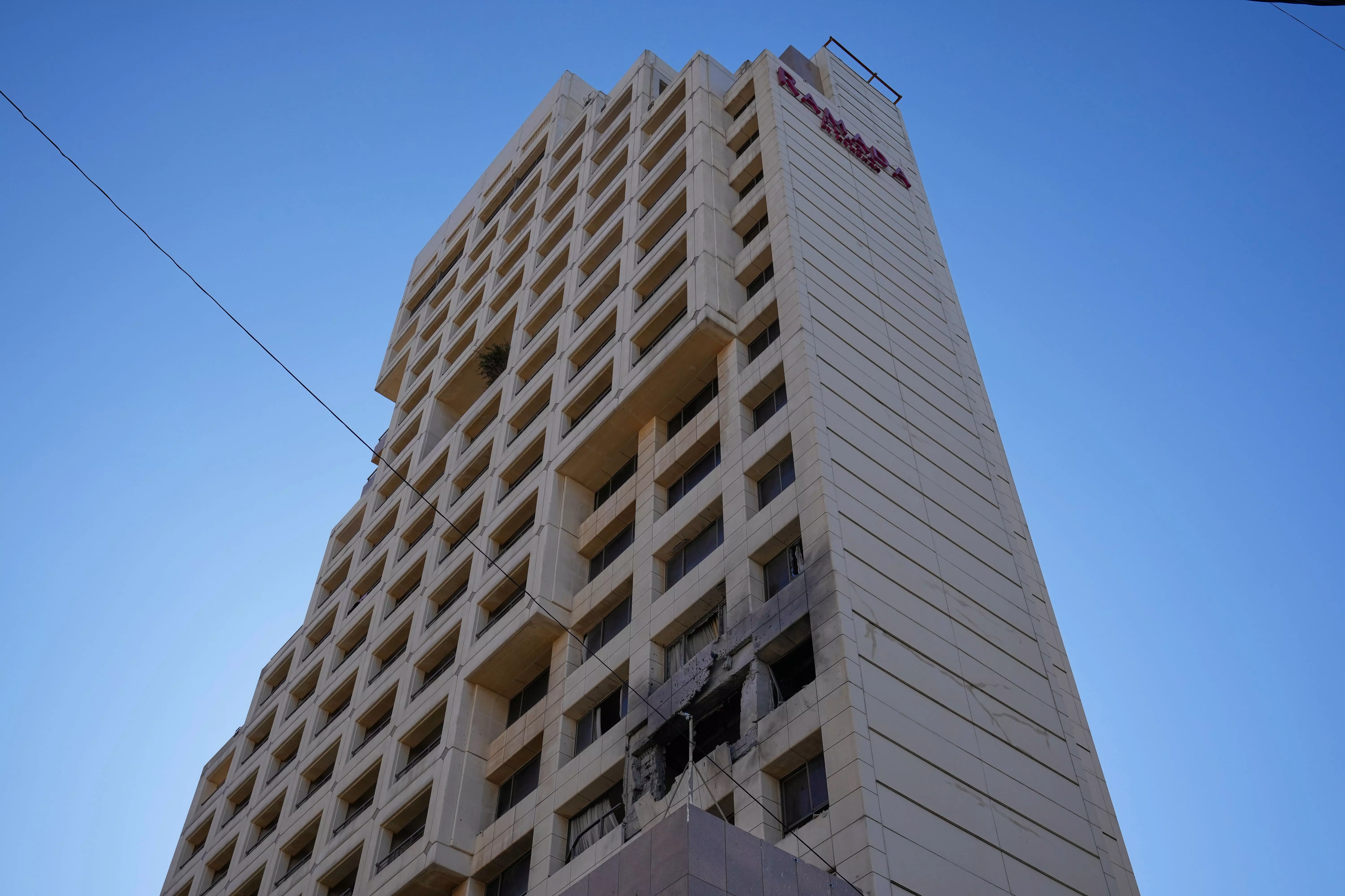Damaged hotel rooms which were hit by Israeli strike are seen in Beirut, Lebanon. (AP Photo/Hussein Malla)
