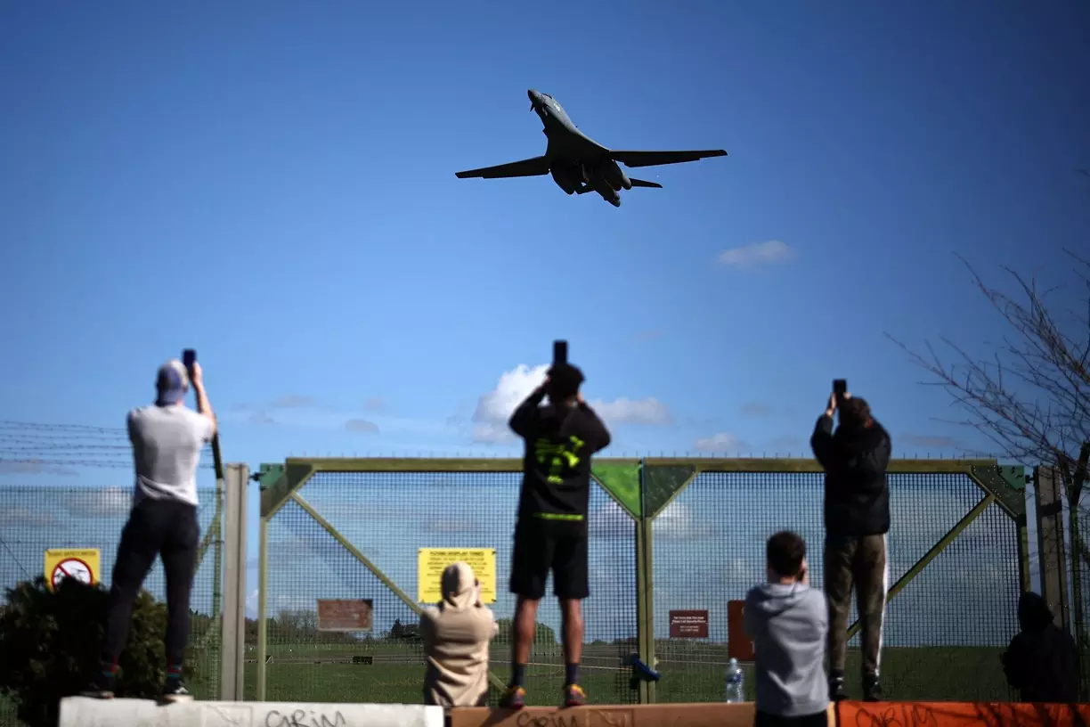 Plane spotters stand at a perimeter fence to see and photograph US Air Force (USAF) B-1 Lancer bomber jets taking off at RAF Fairford in south-west England on March 14, 2026. Fairford is one of two bases, along with the Diego Garcia facility in the Indian Ocean, that the UK has given the US permission to use for "specific defensive operations into Iran" to destroy Iranian missiles at source, the British defence minister said in a statement. (Photo by Henry Nicholls / AFP) - 14 March 2026 7:02 PM IST