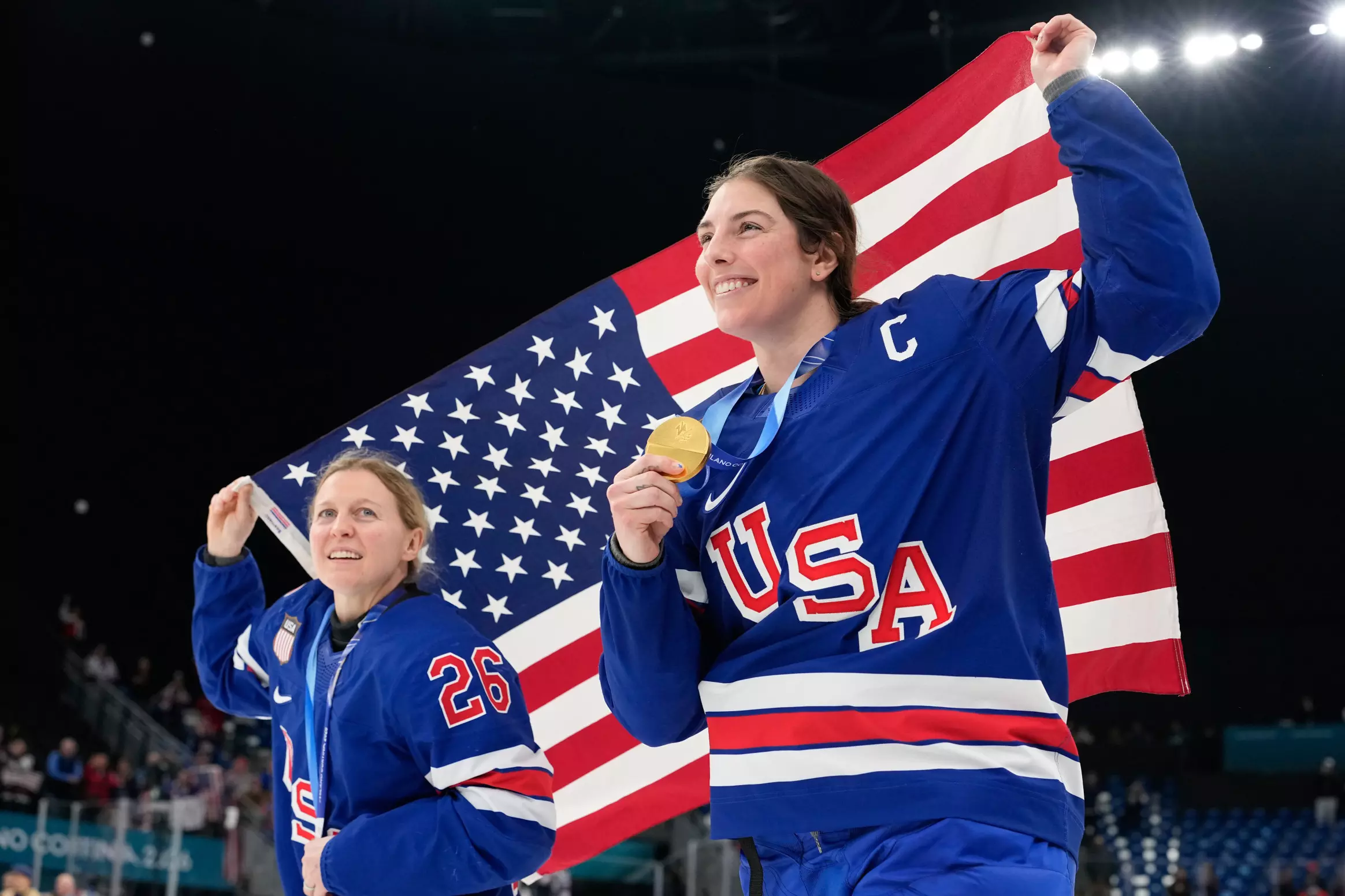 nited States' Kendall Coyne, left, and United States' Hilary Knight celebrate after victory ceremony for women's ice hockey at the 2026 Winter Olympics, in Milan, Italy (AP Photo/Hassan Ammar)