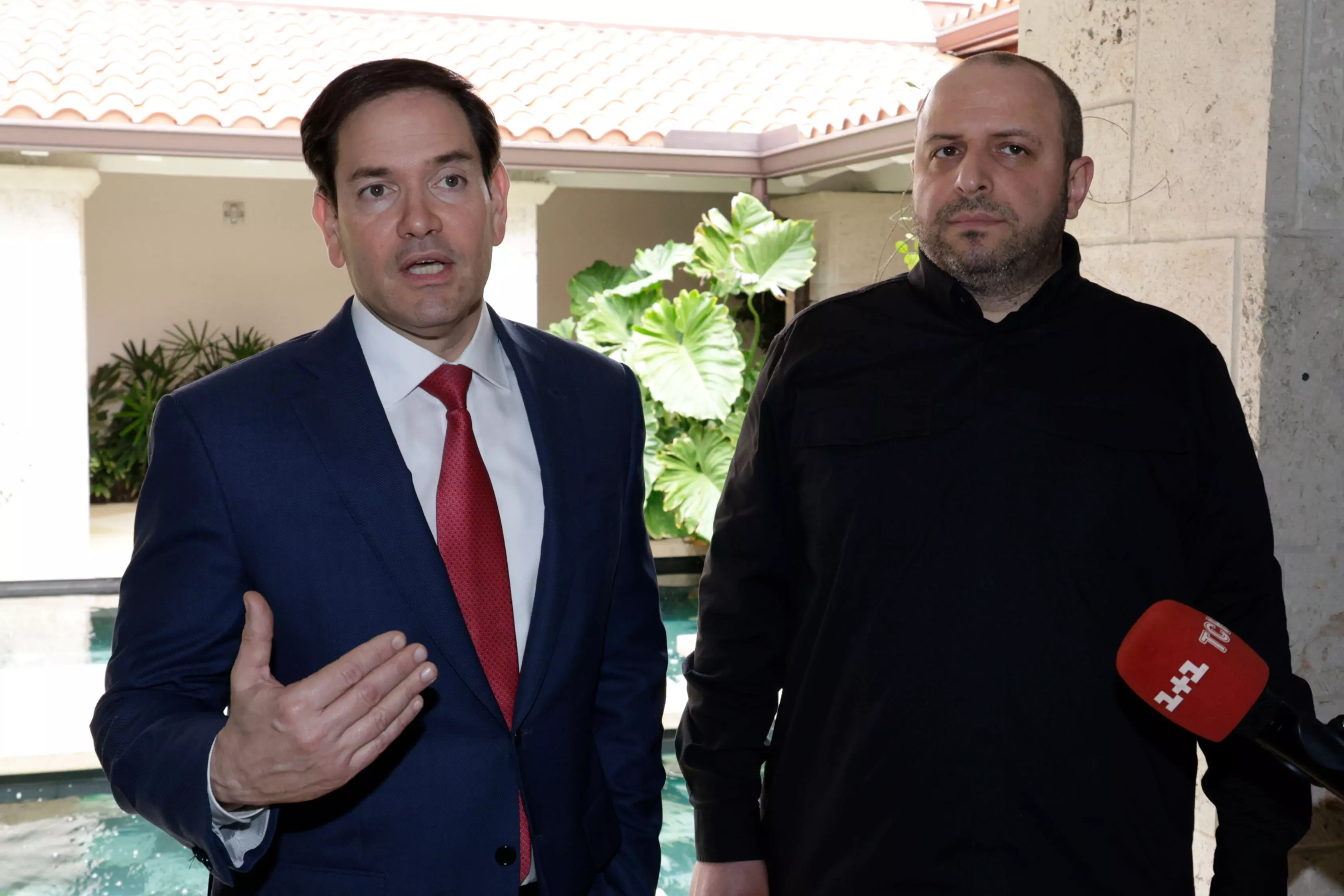 Secretary of State Marco Rubio, left, and Rustem Umerov, Secretary of the National Security of Ukraine talk to the media in Hallandale Beach, Fla. (AP Photo/Terry Renna)