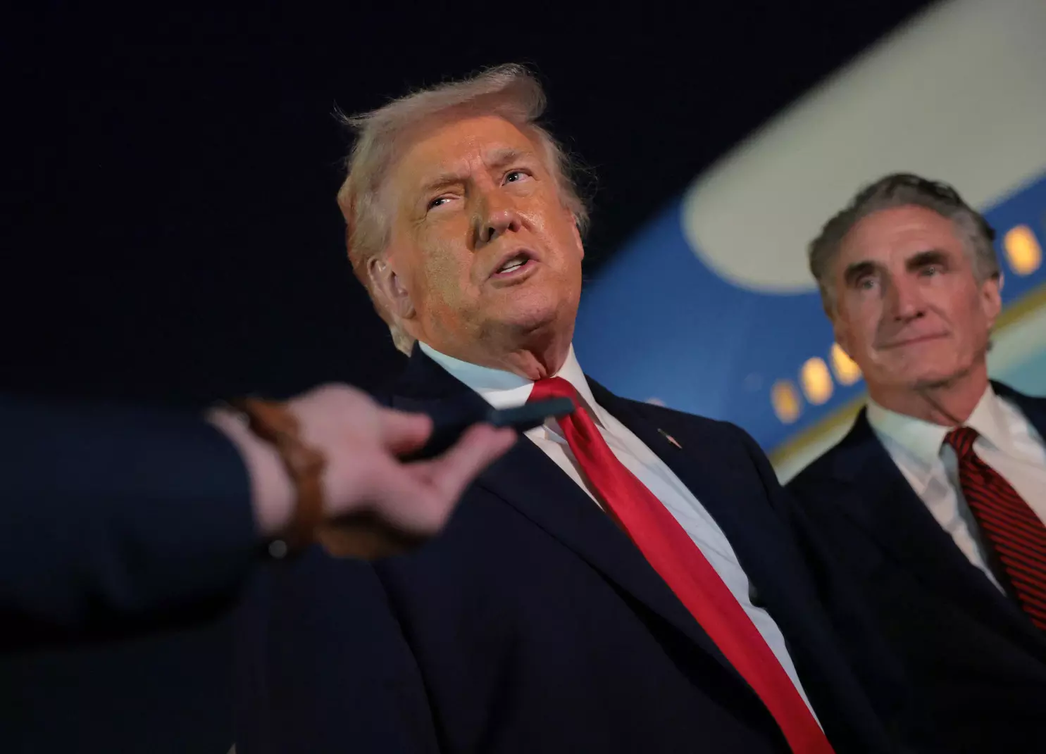 U.S. President Donald Trump talks with reporters as U.S. Secretary of the Interior Doug Burgum (R) looks on at Palm Beach International Airport (AFP)