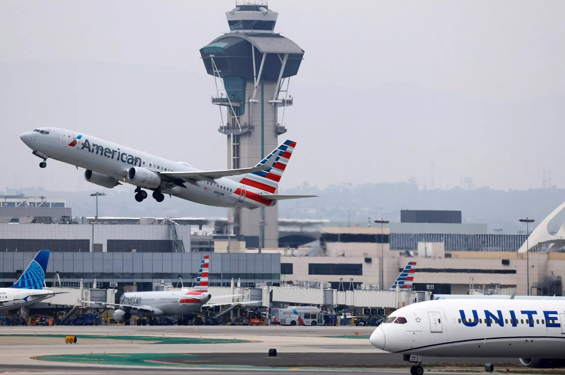 An American Airlines plane takes off near the air traffic control tower at Los Angeles International Airport in Los Angeles, California (AFP)