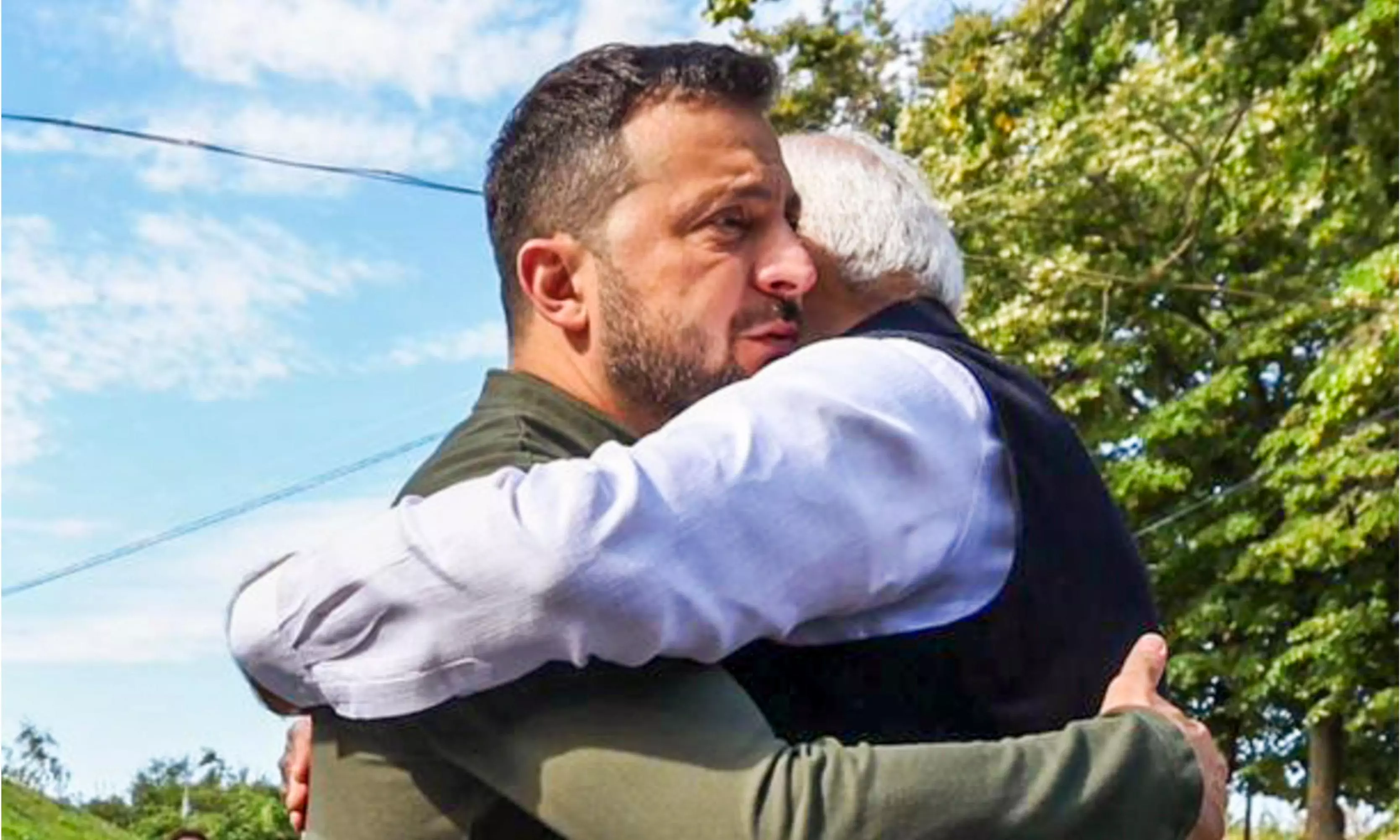 After a handshake, Modi gave a warm hug to Zelenskyy and as the two leaders walked towards the multimedia Exposition, slid a hand on his shoulder symbolising support for the leader of the war-torn nation.
