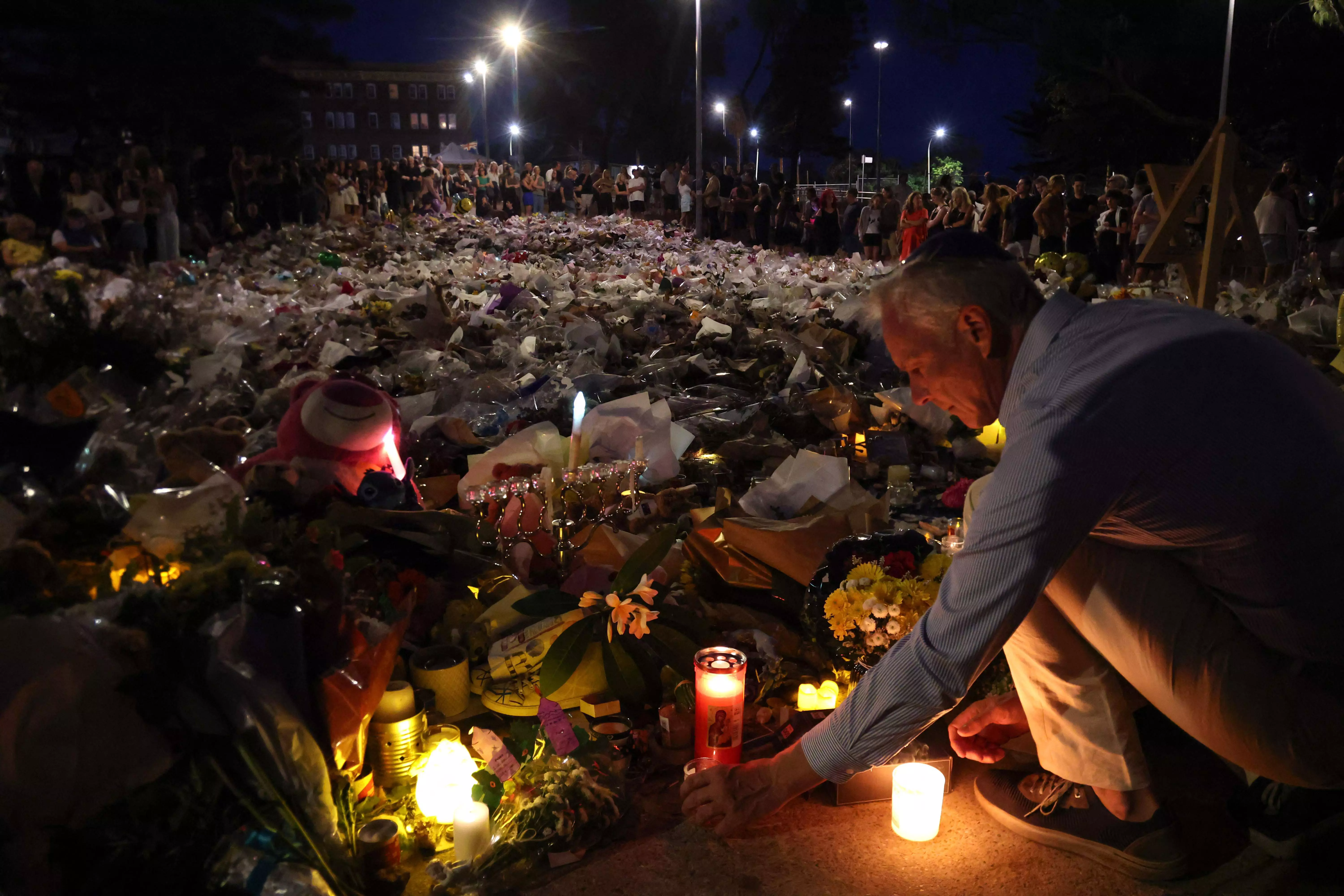 A mourner places a candle next to floral tributes laid in memory of the victims of a shooting at Bondi Beach, in Sydney (DAVID GRAY / AFP)