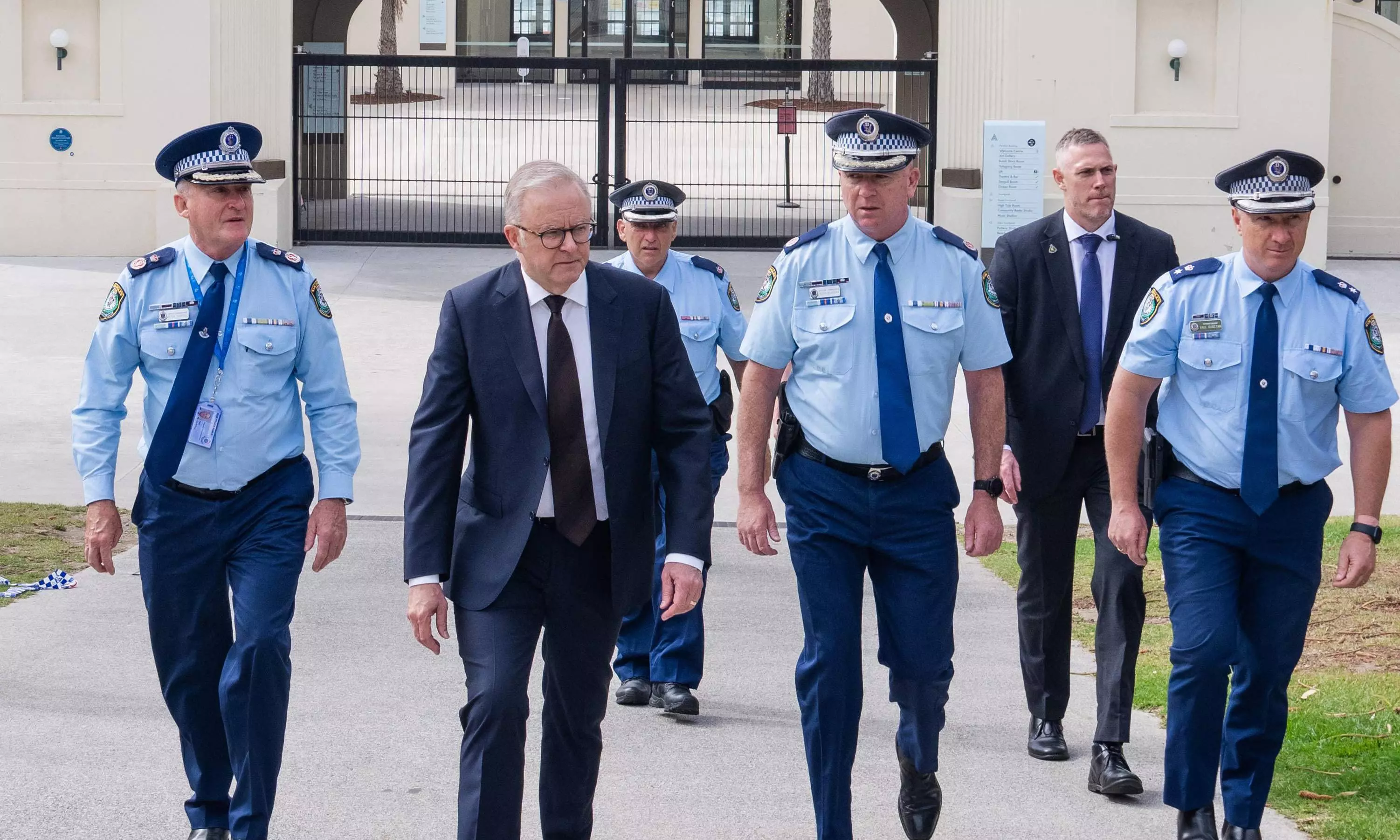 A handout photo taken and released by the Australian Prime Minister's Office on December 15, 2025 shows Australia's Prime Minister Anthony Albanese (2nd L) walking with police officers after laying flowers at the Bondi Pavillion at Bondi Beach, the scene of a shooting where 15 people were killed. A father-and-son team toting long-barrelled guns shot and killed 15 people including a 10-year-old girl at Sydney's Bondi Beach on December 14, with authorities labelling it an antisemitic terrorist attack on a Jewish festival. (Photo by Handout / AUSTRALIAN PRIME MINISTER'S OFFICE / AFP)