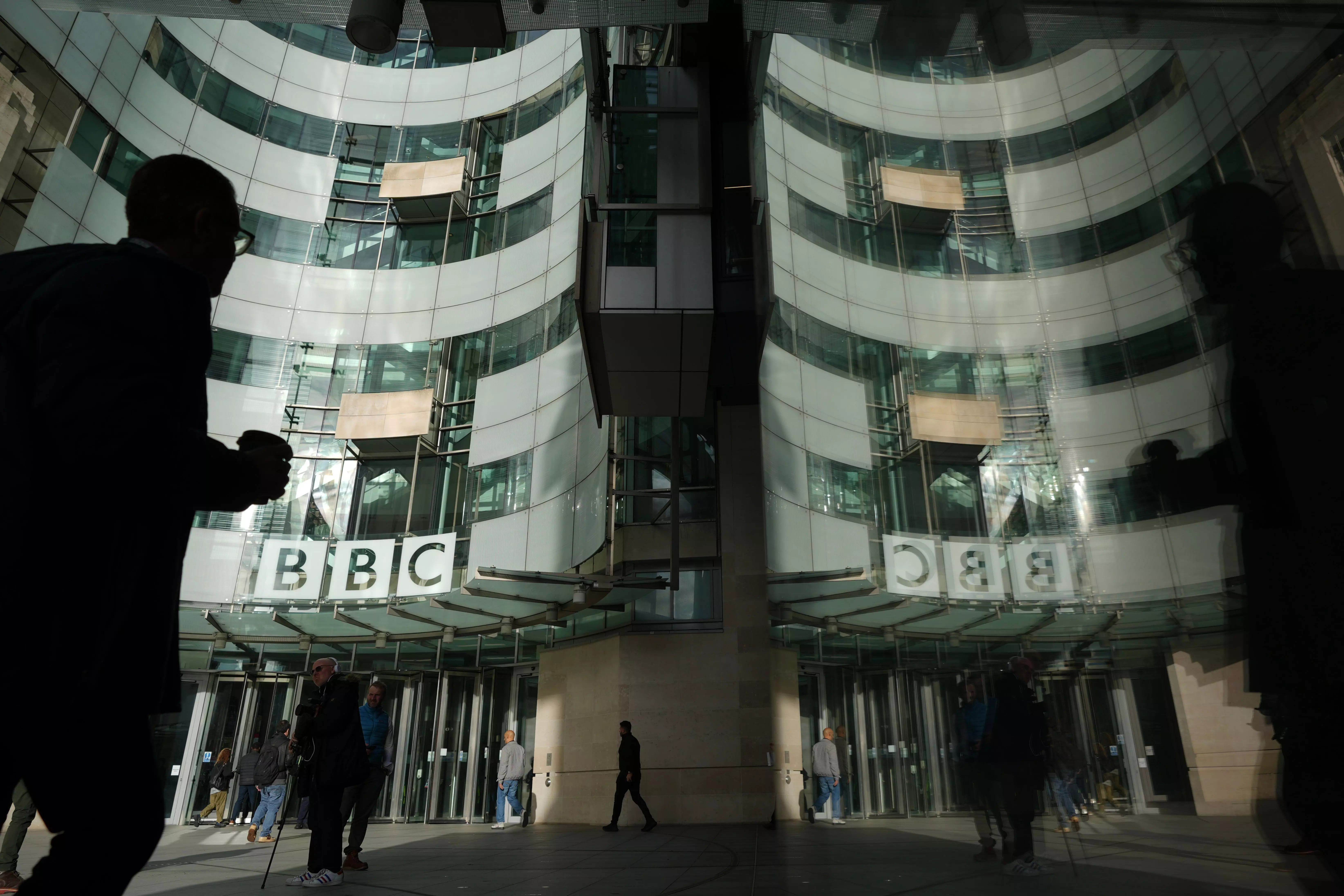 Pedestrian walks outside the BBC Headquarters in London, Wednesday, Nov. 12, 2025. (AP Photo/Kin Cheung, file)