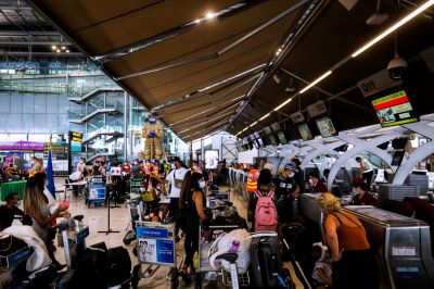 French nationals wait at the check in area to board a chartered flight to France organized by the French government to evacuate its citizens from Thailand as cases of COVID-19 novel coronavirus increase, at Suvarnambhumi Airport in Bangkok - AFP