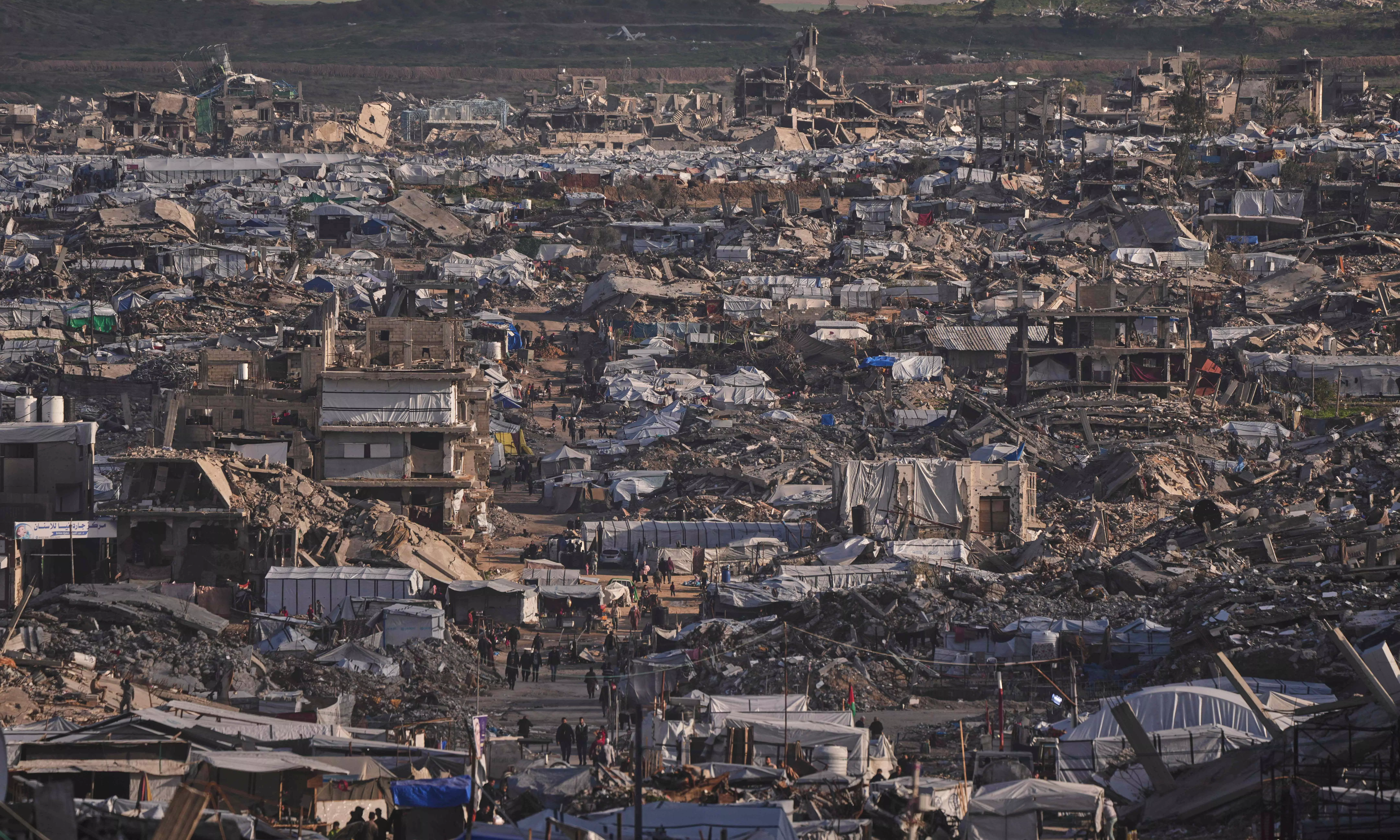 Makeshift tents shelter displaced Palestinians stand among buildings destroyed by Israeli air and ground operations in Gaza City. (AP Photo)