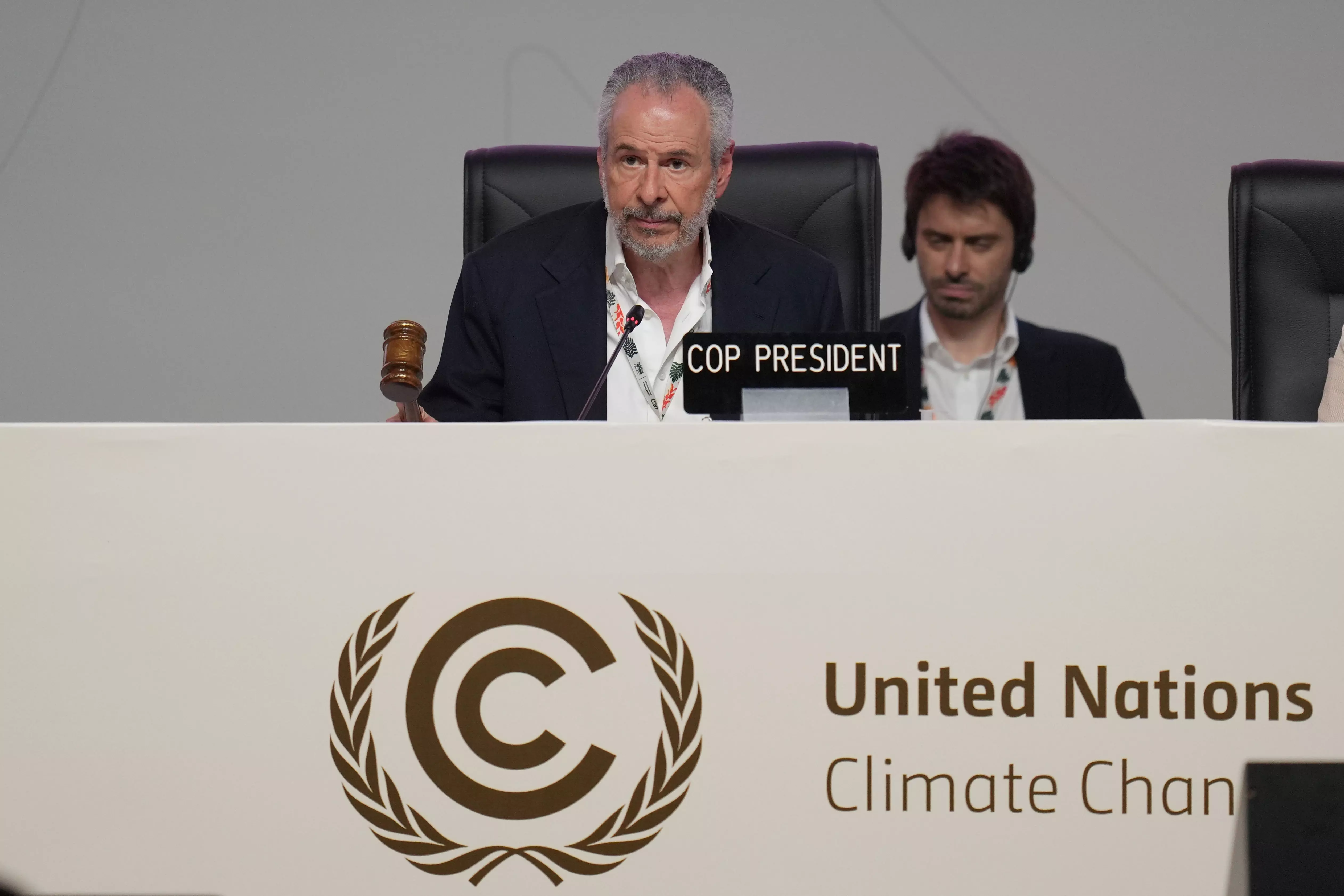 André Corrêa do Lago, COP30 president, bangs a gavel during a plenary session at the COP30 U.N. Climate Summit, in Belem, Brazil. (AP Photo/Andre Penner)