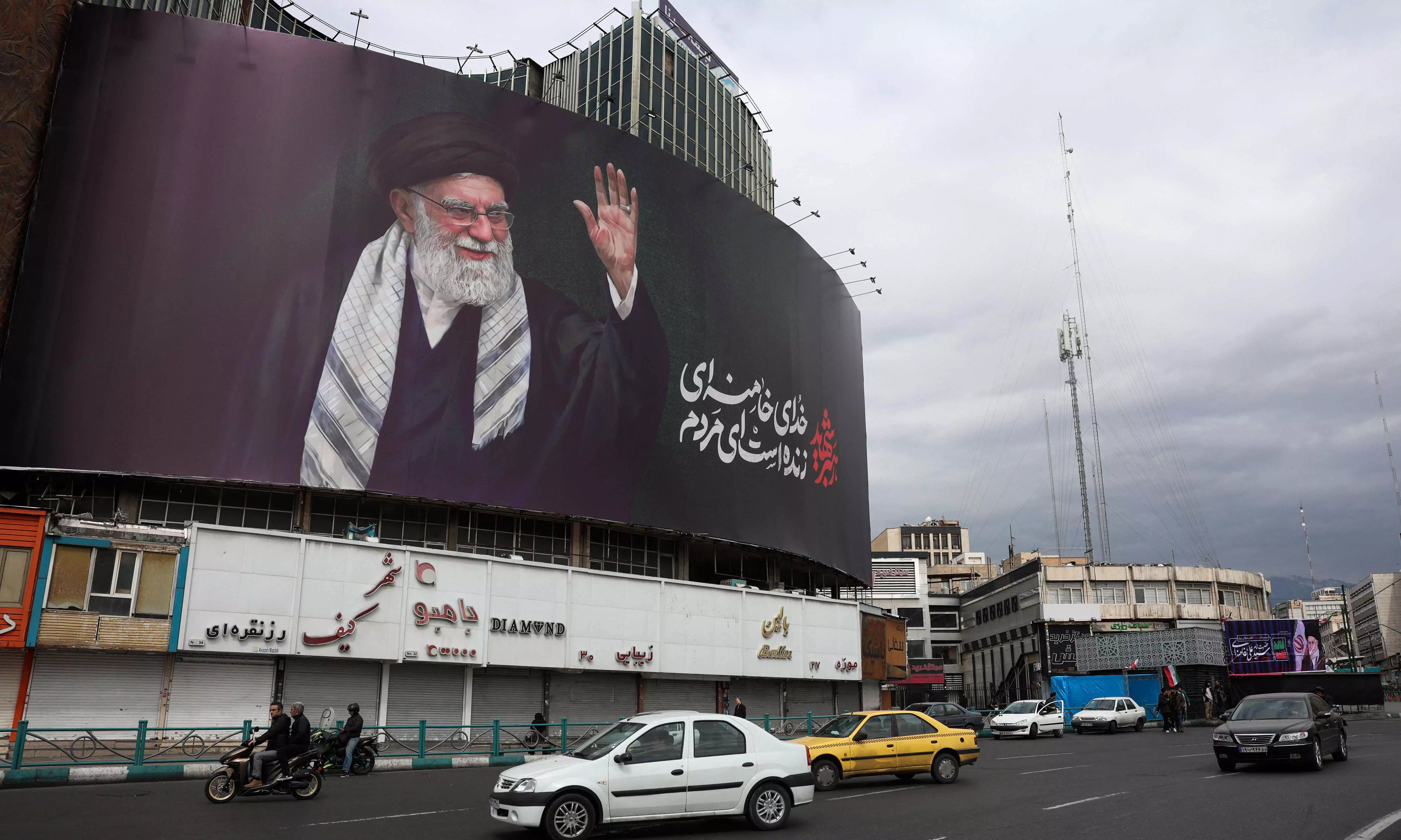 Motorists dirve past a billboard of Iran’s supreme leader Ayatollah Ali Khamenei in Tehran on March 2, 2026. Israeli strikes on Lebanon killed at least 31 people on March 2, authorities said, following rocket fire from Tehran-backed militant group Hezbollah after the killing of Iran's supreme leader. (Photo by AFP)