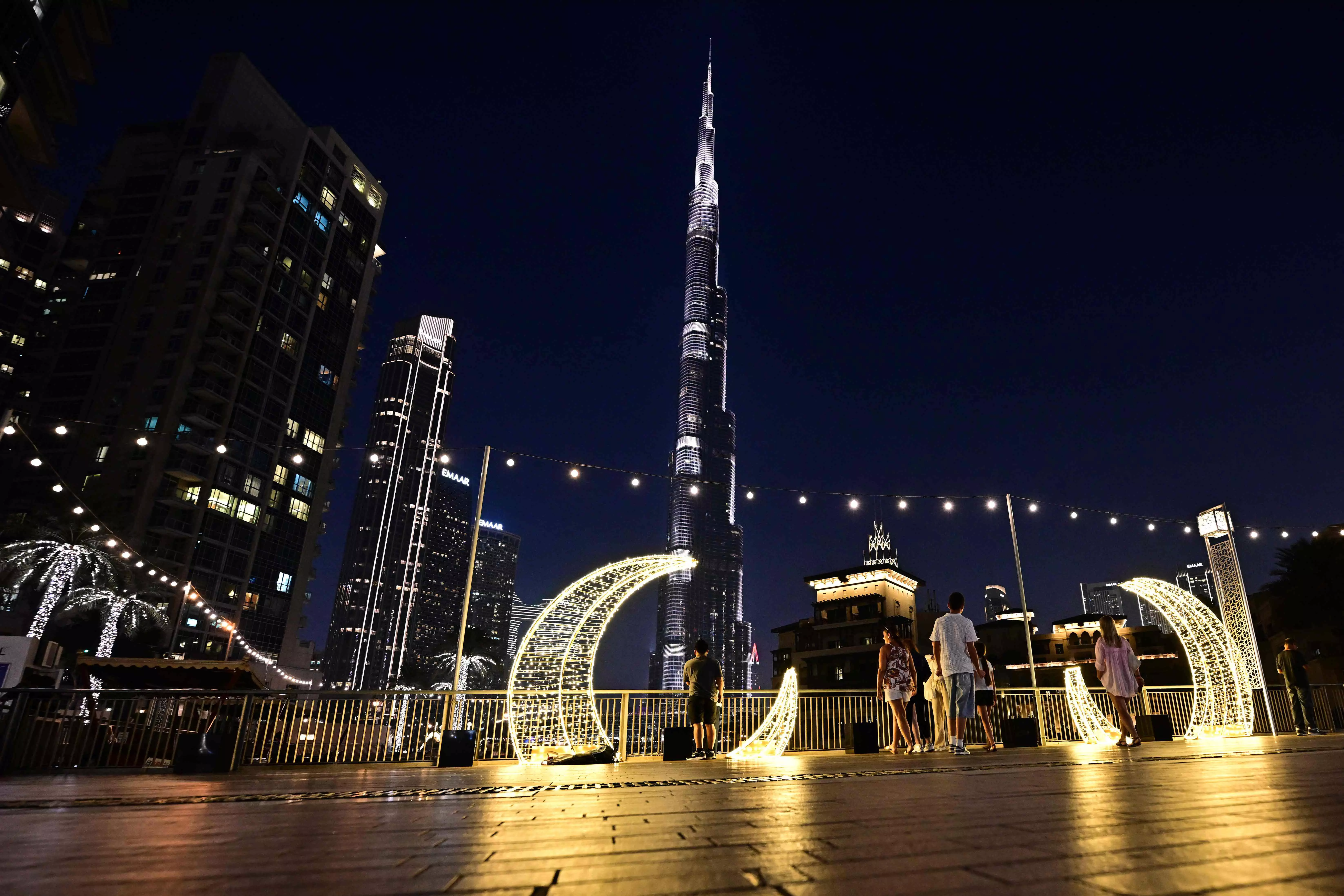 People stand near crescent-shaped festive decorations are pictured near Burj Khalifa in the centre of Dubai on February 24, 2026 during the Muslim holy fasting month of Ramadan. (Photo by Giuseppe CACACE / AFP)