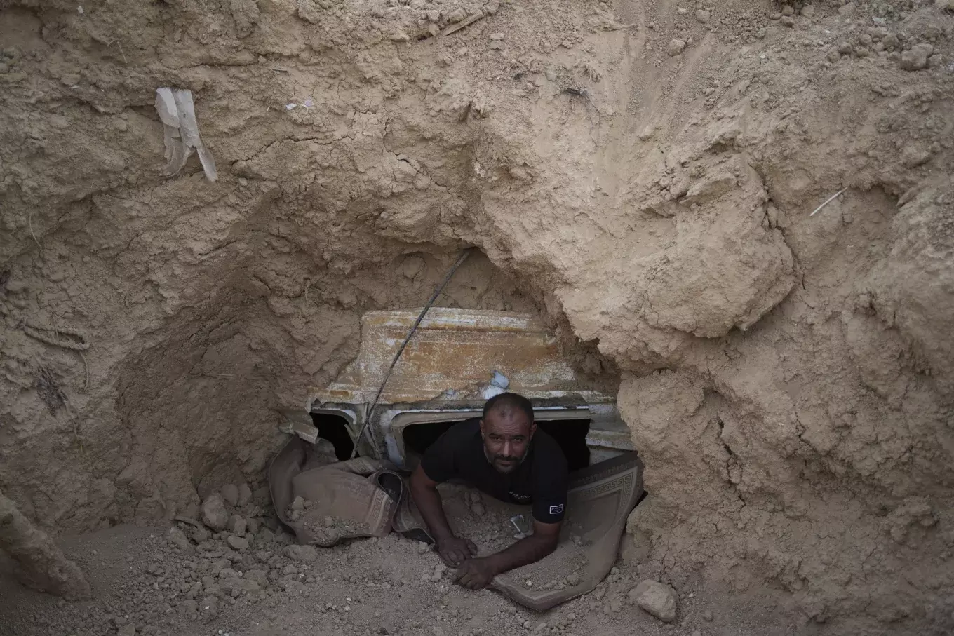 Ahmed Abu Ganima poses for a portrait in the window of the minibus buried in the earth, a makeshift bomb shelter his family uses in Khashem Zaneh, an unrecognized Bedouin village in the Negev Desert, southern Israel, July 2, 2025. (AP Photo/Maya Alleruzzo)