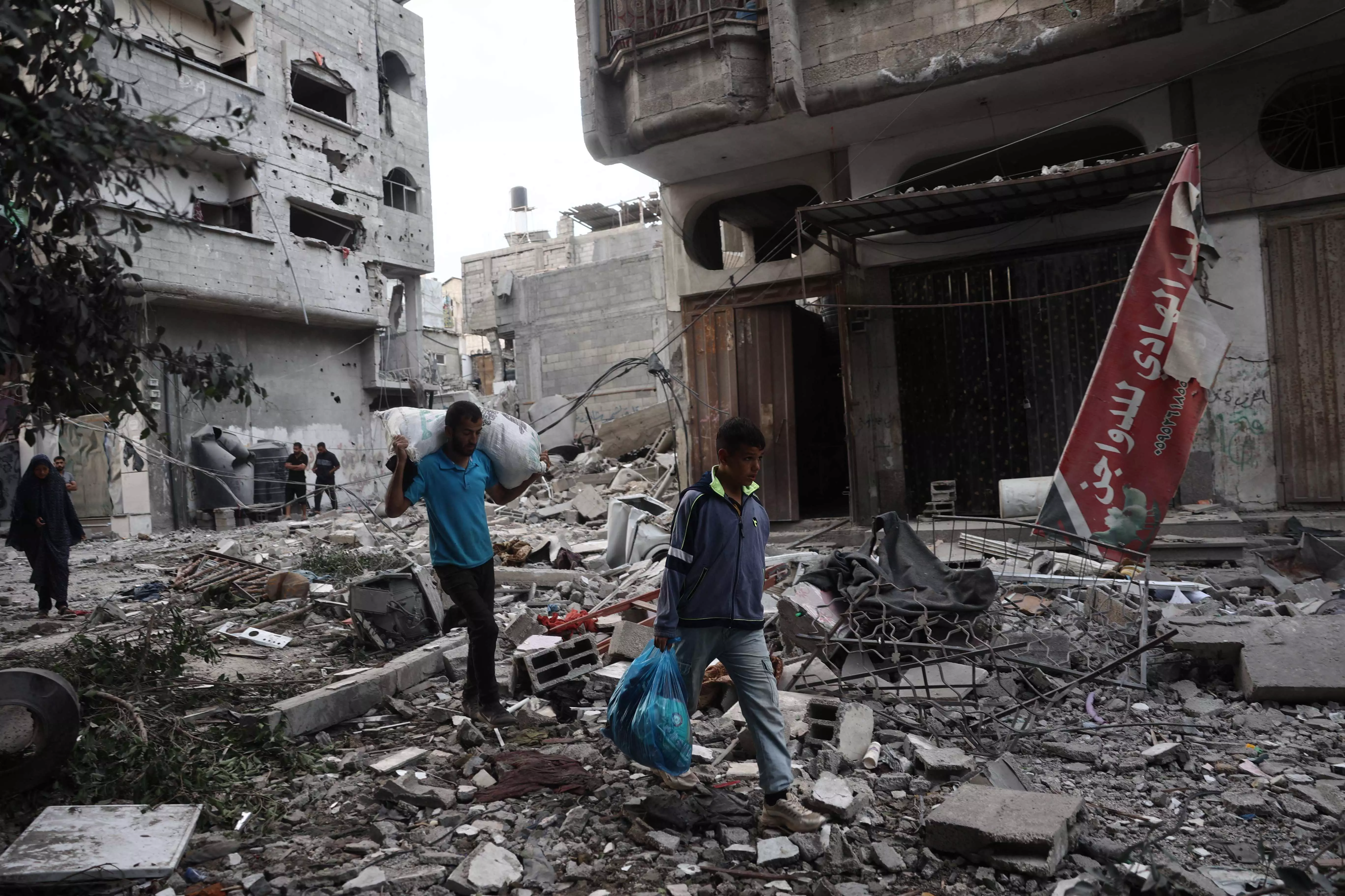 People carry amid the rubble of buildings damaged during an Israeli air strike the previous night on the Bureij refugee camp in the central Gaza Strip on October 8, 2024, amid the continuing war between Israel and the Palestinian militant group Hamas. (Photo by Eyad BABA / AFP)